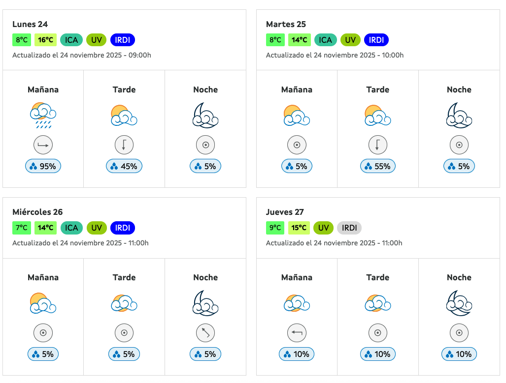 Tras el paso del frente, la tarde, previsiblemente, tendrá una tendencia a la apertura de claros y con lluvias ocasionales. En cuanto a las temperaturas, las mínimas descenderán ligeramente y las máximas tendrán un ligero ascenso.
