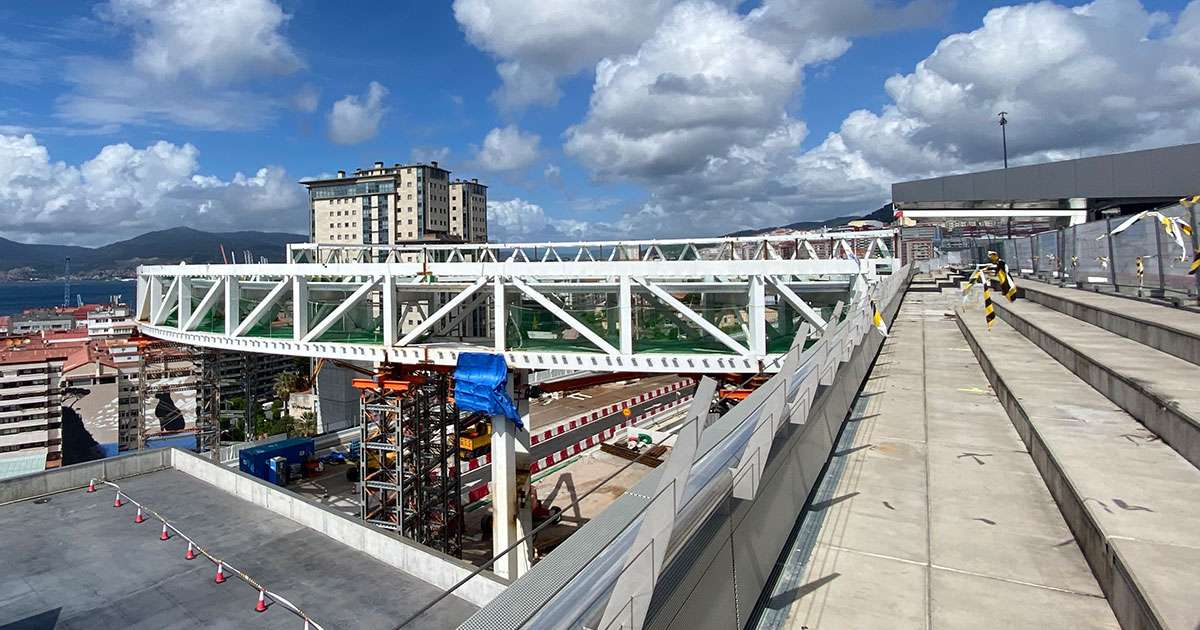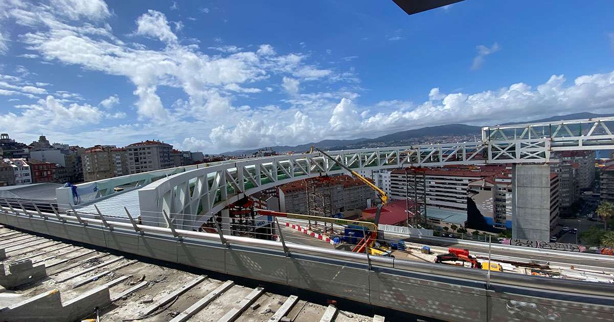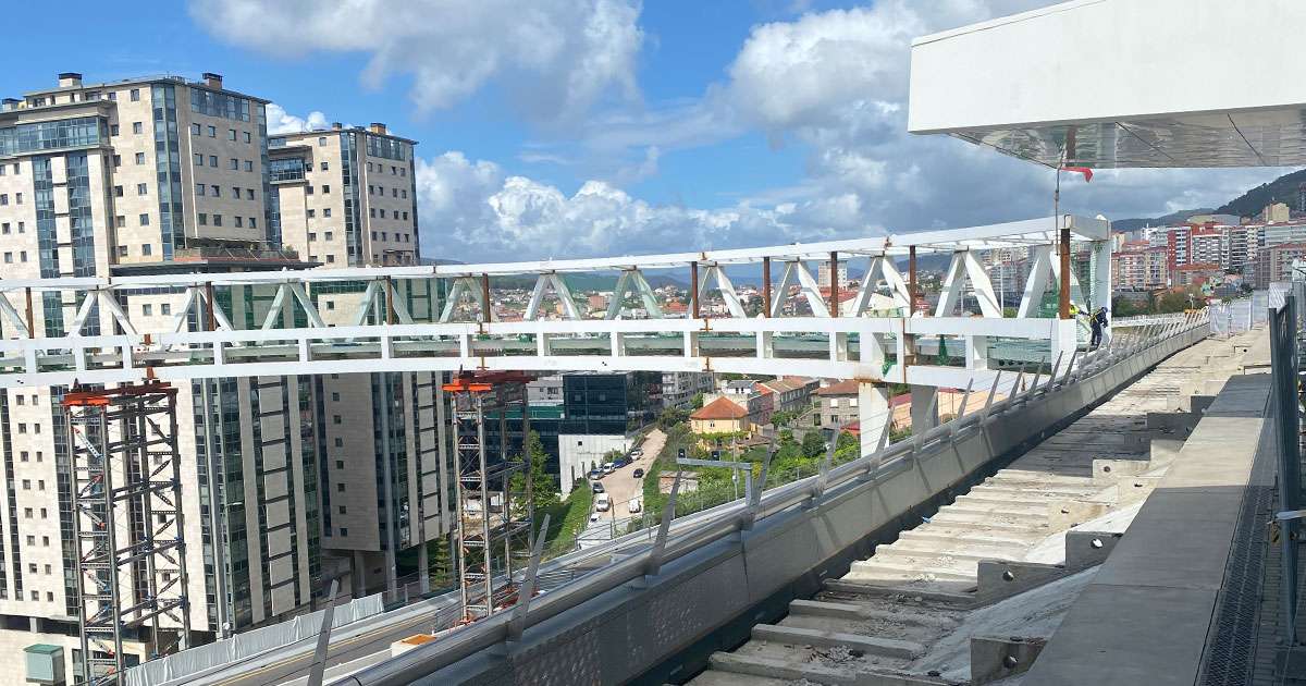 La parte más llamativa de los trabajos se centra ahora en al conexión con la plaza pública del Vialia. El anillo "flotante" se completó el pasado mes de abril y ahora deberá resolverse el enlace de ambos brazos del anillo, que se conectarán con la parte central de la terraza pública del edificio diseñado por Thom Mayne.