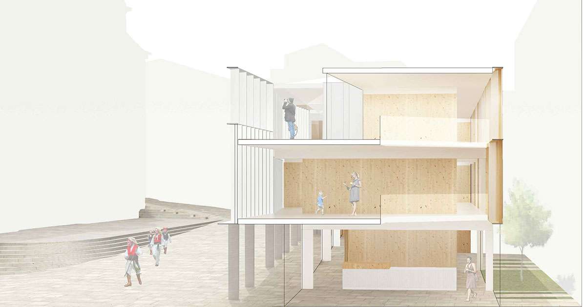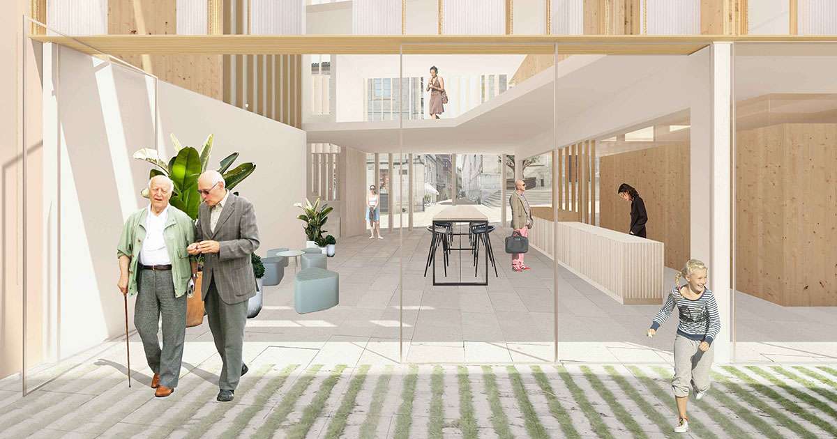 El proyecto entiende el interior del edificio en planta baja como extensión de la plaza de la Iglesia. Sin embargo, "no pretende imitar este espacio, ni sustituir sus funciones, sino complementarlas y separarse mediante el filtro creado por la sombra del espacio porticado", se explica en la memoria ganadora. Con el telón de fondo iluminado de un patio ajardinado, se crean dos espacios concentradores de vida: un microauditorio, y un atrio – área de encuentro. Con vocación de accesibles al público en general, y la posibilidad de acoger eventos puntuales: eventos y actuaciones,