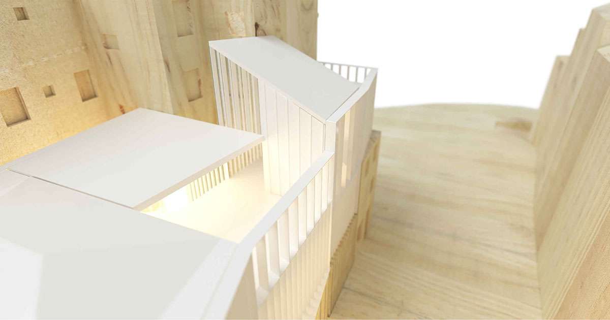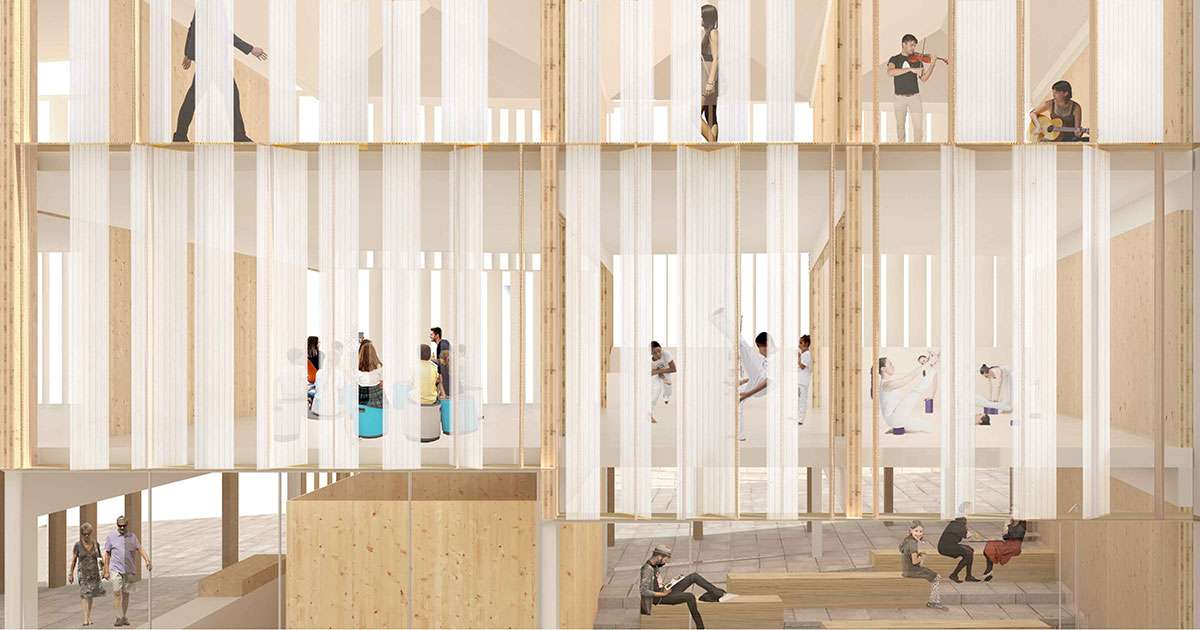 El interior del edificio se adapta a la pendiente del exterior, aprovechando el desnivel para la formación de la grada – microauditorio. En las plantas superiores, laminando el edificio en niveles horizontales, se plantea su unificación vertical mediante el atrio principal a triple altura, en el que se desarrolle los momentos de interacciones social más públicos, ensanchando los espacios de circulación para convertirlos en espacios de estancia y uso común, en el que reunirse, hacer un taller, tener una conversación, tomar un café. Se vincula este atrio a las edificaciones con menor fondo, en las que se concentran las comunicaciones verticales y los servicios, de modo que se liberan las zonas con mayor fondo para acoger usos diversos.