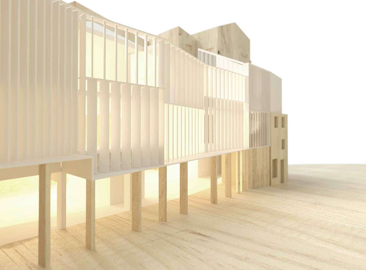 La propuesta establece una estrategia de actuación unitaria para un conjunto radicalmente fragmentado. Lo hace planteando un entrelazado sutil de la escala monumental, regia y uniforme con una planta baja porticada en línea recta y formalizada en columnas de piedra. Las plantas superiores asumen la tipología de construcción entre medianeras, y hacen referencia a un pasado fragmentado y dispar mediante quiebros intencionados que ponen en valor lo positivo del conjunto edificado actual: el rico juego de perspectivas que se produce en el ascenso desde la Praza da Pedra.