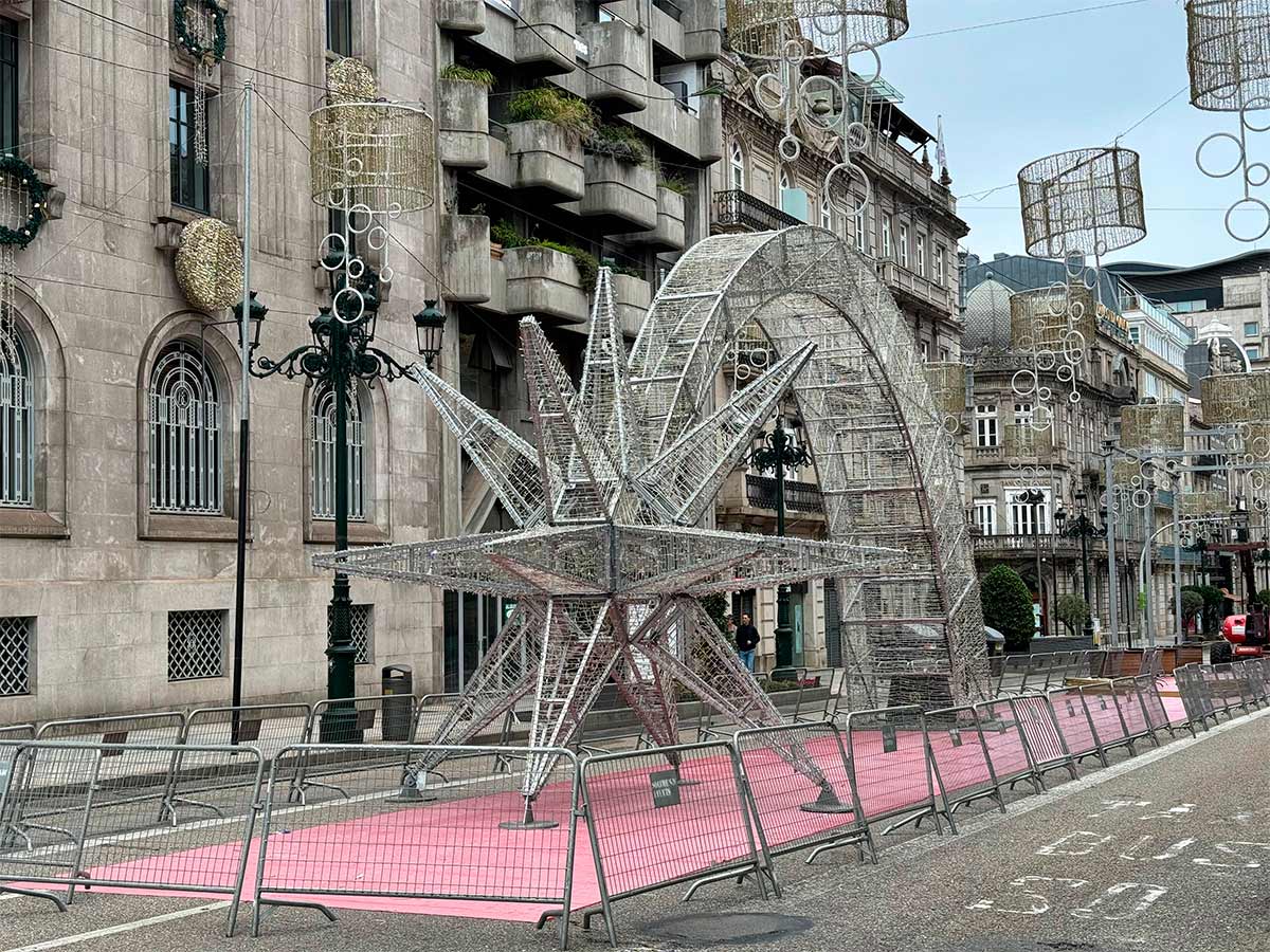A falta de una semana para ese acto de inicio de la Navidad de Vigo, todavía queda por montar todos los sets navideños que acapararán miles de fotografías y selfis desde el próximo sábado hasta después de Reyes. Para facilitar los trabajos, el Concello ha establecido cortes de tráfico en Areal y en tramos de Policarpo Sanz y García Barbón, donde ya hay un buen número de paradas de Vitrasa anuladas, por lo que las usuarias y usuarios de transporte público ya empiezan a adaptarse a los efectos que supone tener una Navidad que ha convertido a Vigo en una de las capitales navideñas del país.