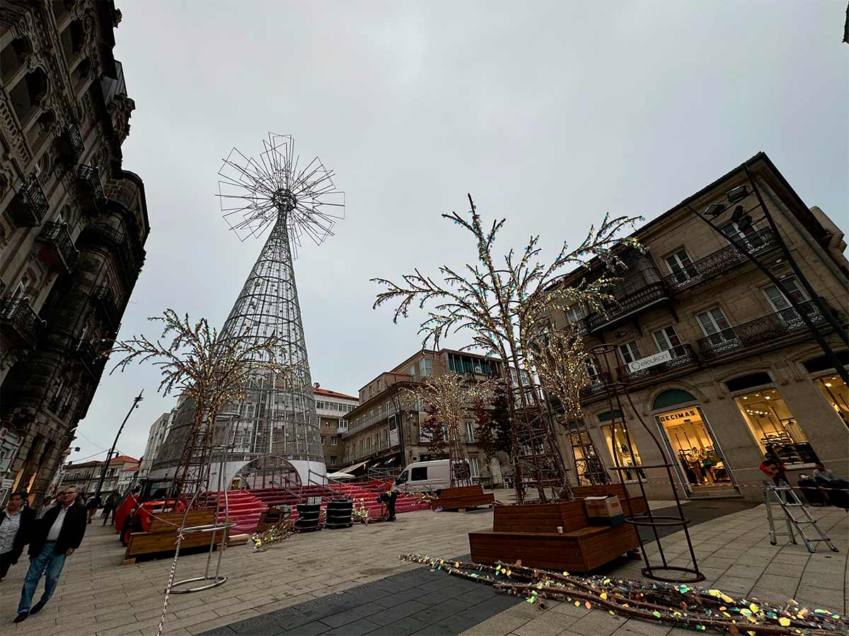 Si la mañana era soleada, la tarde abría el debate sobre si la lluvia acabaría estropeando el paseo de la tarde. Vigueses y visitantes, algunos de ellos procedentes del país vecino (y amigo) de Portugal, transitaban por las calles del centro de Vigo. Todos ellos, unos de forma más activa y otros con más indiferencia, eran testigos de cómo los operarios se afanaban en completar el bosque de árboles de Navidad que habrá en Porta do Sol o cómo daban los últimos retoques a la instalación de la noria de más de 50 metros de altura que, desde su desembarco en 2019, se ha convertido ya en uno de los clásicos de ese macroparque temático navideño que forma parte de la etiqueta "Navidad de Vigo".