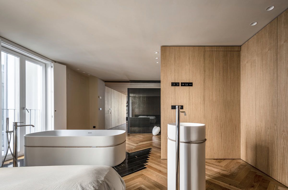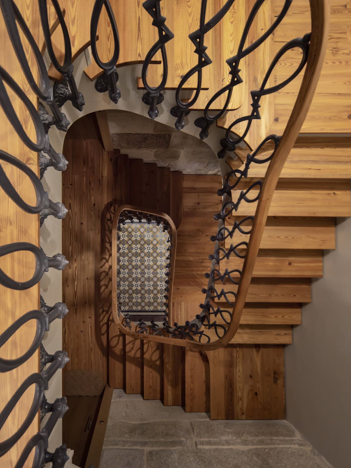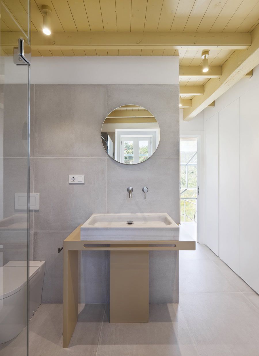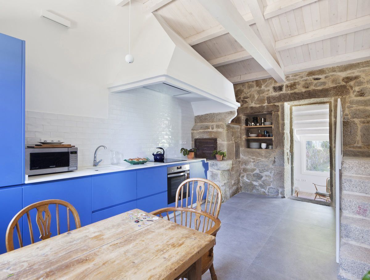 Las ventanas verde agua y los techos amarillos son elementos preexistentes que se han conservado. El azul de la cocina se añade como un complemento armónico. La chimenea permanece en su lugar original, y la campana se ha reutilizado integrándola en el hueco existente. El diseño abarcó también gran parte del mobiliario: cocina, baños, armarios, mesa de comedor y estructuras de las camas. El resto del mobiliario procede de otra casa. Toda la iluminación está diseñada para resaltar las piezas más significativas, como la campana de la chimenea o los lavabos de mármol reutilizados.