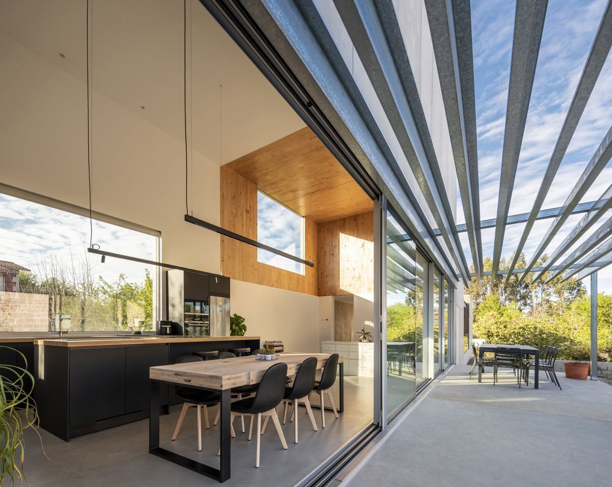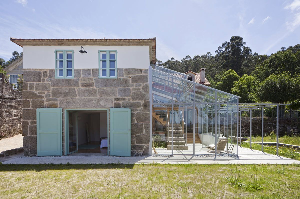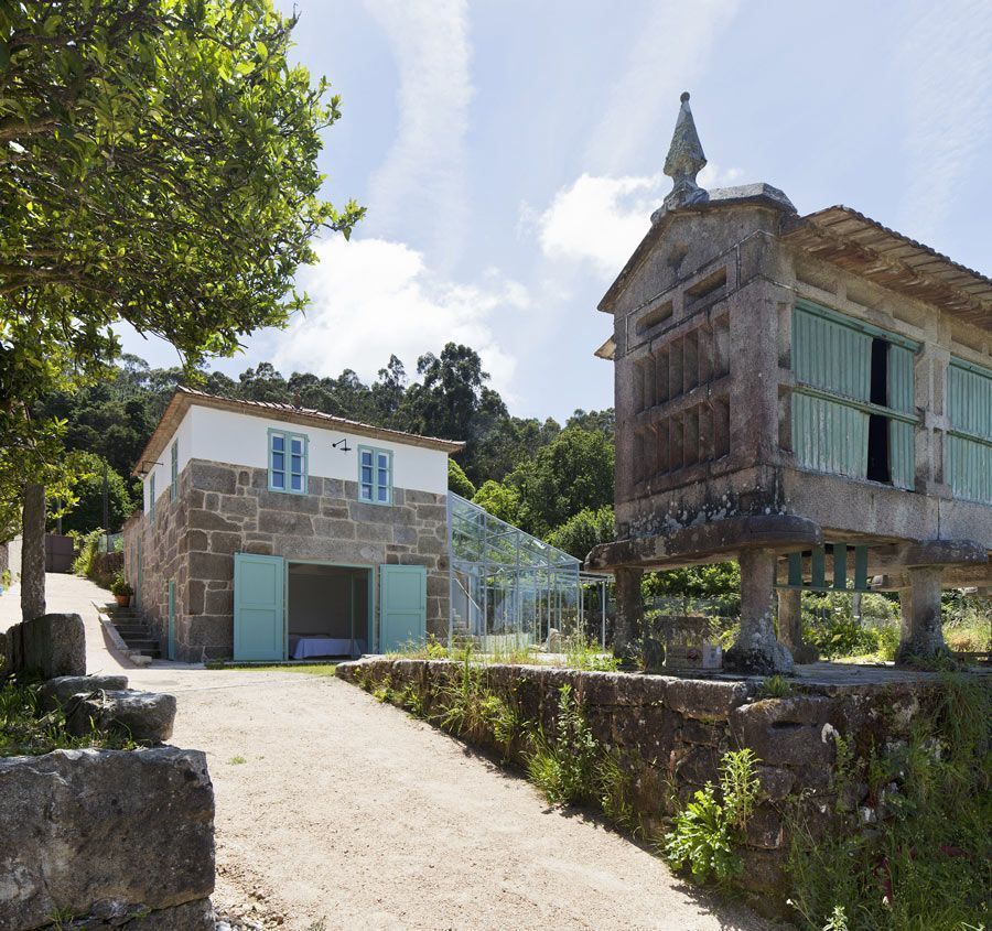 En los exteriores, se han proyectado pavimentos de granito y jabre, drenantes y tradicionales. El hórreo ubicado frente a la casa se integra visualmente, permitiendo que pueda contemplarse y disfrutarse tanto desde el salón como desde los dos dormitorios.