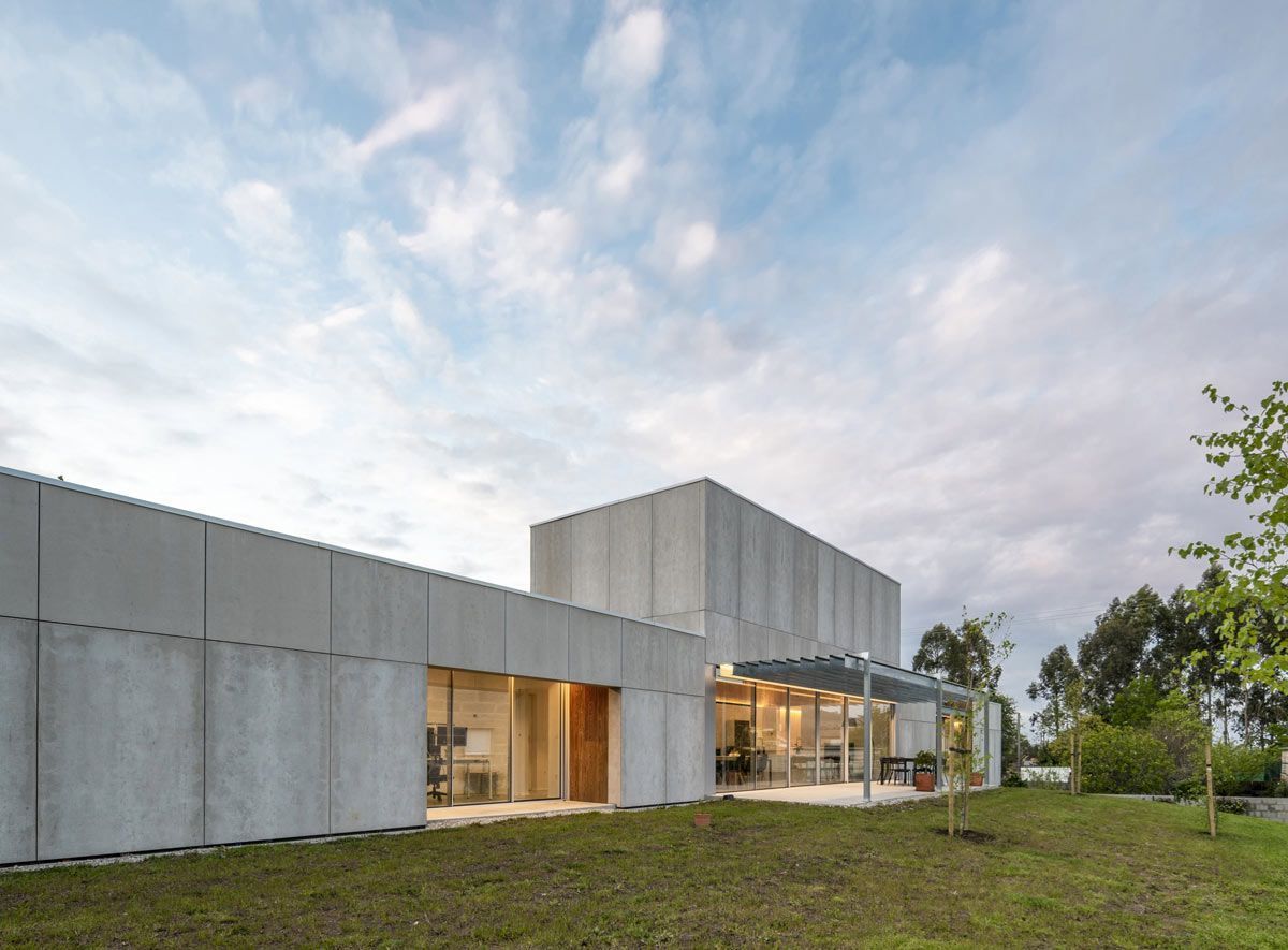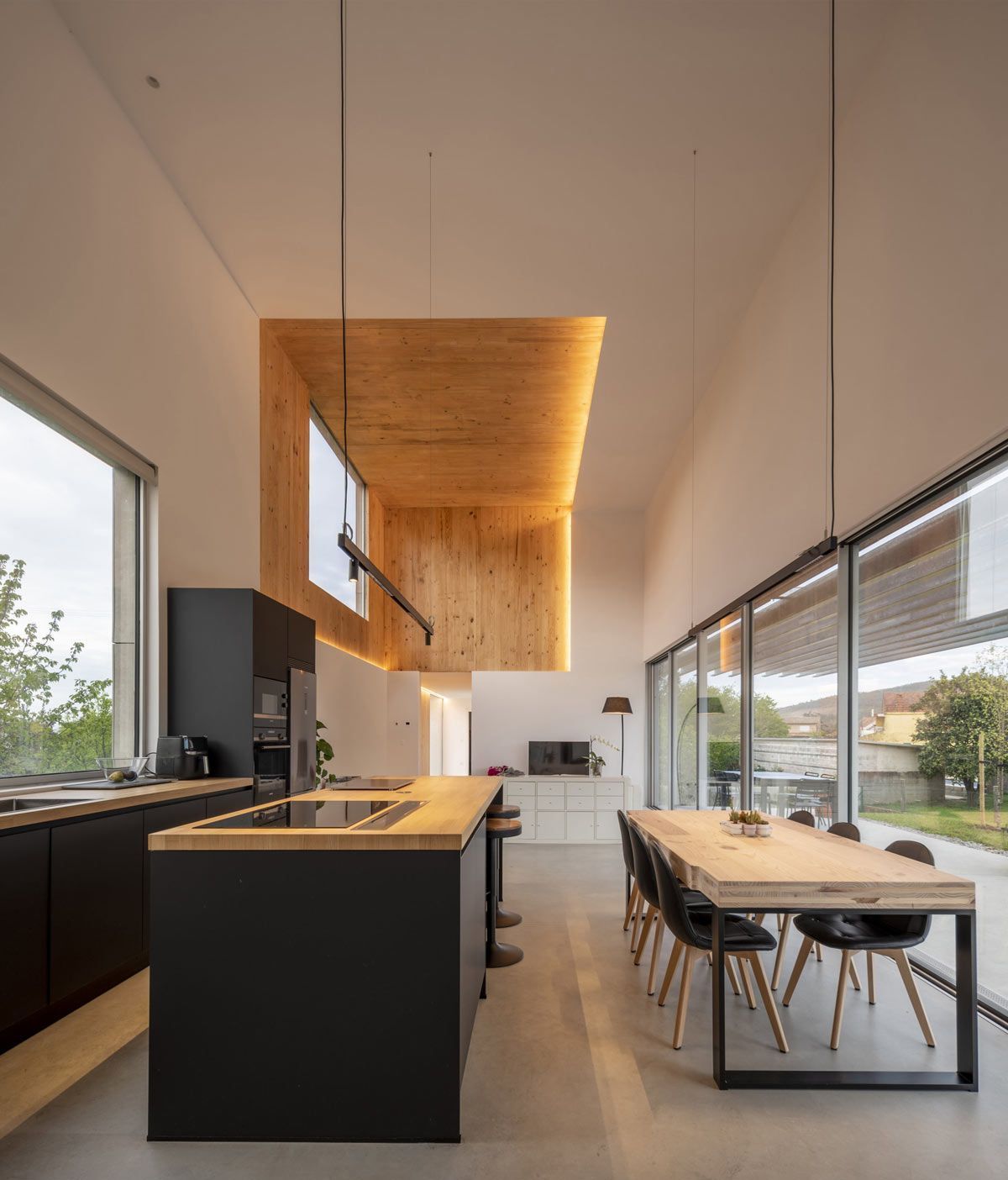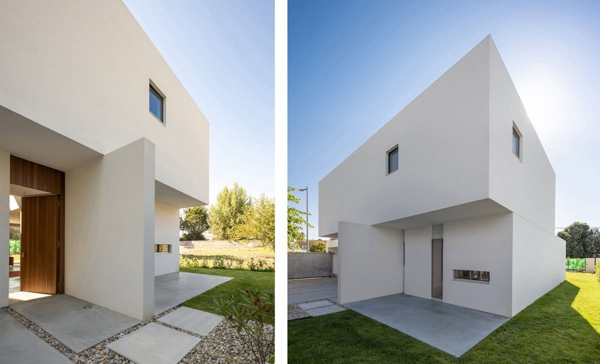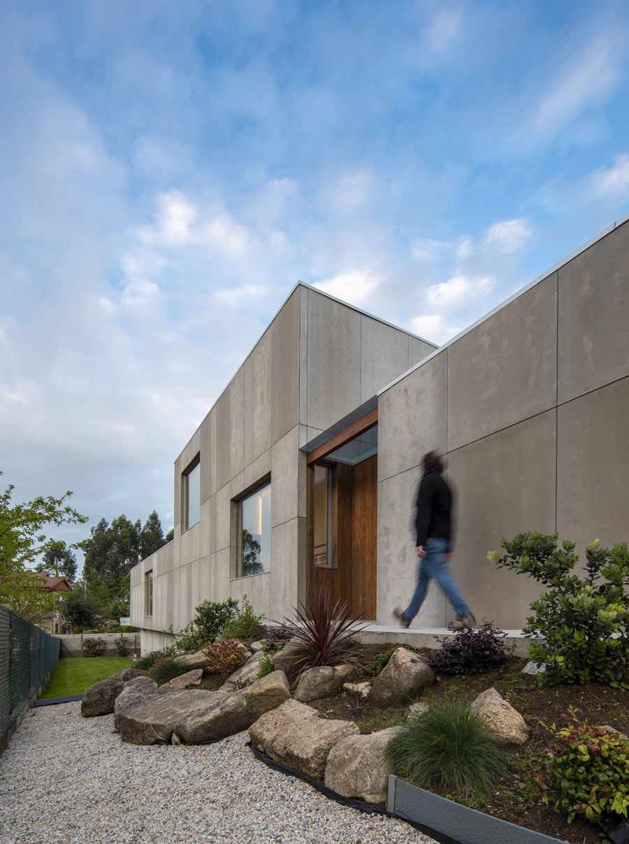 Vivienda de diseño sobrio, construida con paneles prefabricados de madera y cemento buscando la integración estructural y espacial. La edificación se plantea como una banda lineal al linde norte de la parcela de 5 metros de ancho y 36 metros de largo y en cuyos alzados longitudinales podrían resolverse con 7 paneles estructurales de madera contralaminada, actuando uno de ellos como una gran viga de 12 metros de largo y 14 centímetros de ancho, que permitiría la apertura total del espacio a doble altura de salón y cocina hacia el sur.