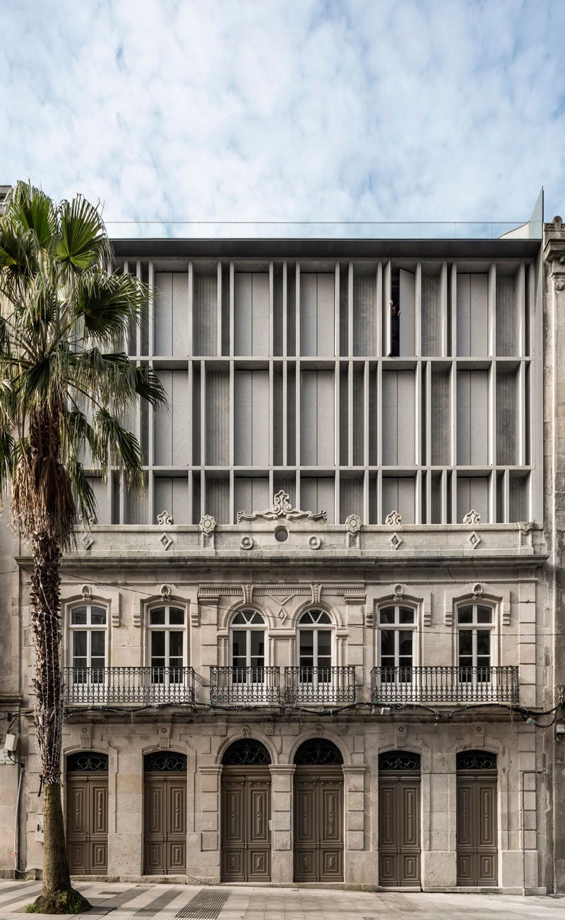La actuación consiste en una ampliación de fachada respetuosa con el edificio original, reinterpretando el sistema porticado en granito y aportando profundidad arquitectónica. La ampliación del edificio se entiende como una nueva capa de valor arquitectónico diferenciada de la anterior procurando que pueda discernirse de forma clara el objeto catalogado de la parte que se adiciona. El edificio original nombrado como Casas de Francisco Álvarez es obra del arquitecto Jenaro de la Fuente, diseñado en 1909. En el estado anterior a la rehabilitación, el edificio se encontraba en ruina técnica como consecuencia de la entrada de agua de lluvia tras el colapso de la cubierto.
