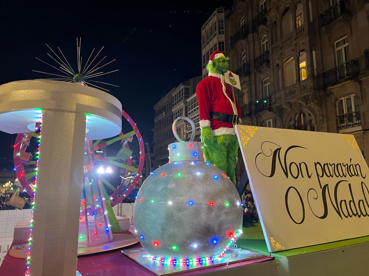 Ya es oficial. Vigo ya se encuentra inmerso en la celebración de una nueva edición del Entroido, una festividad que va ganando adeptos año a año en la ciudad y que se prolongará hasta el próximo miércoles 5 de febrero. El acto que marca el comienzo del Carnaval vigués es la Entronización del Meco, que, como avanzó este diario, este año tiene como principal personaje a un Grinch que se encuentra pisando un árbol de Navidad. La figura está acompañado de elementos icónicos de la ciudad olívica como el ascensor Halo, la noria, el Árbol de Porta do Sol y la Bola de Navidad de Urzáiz.