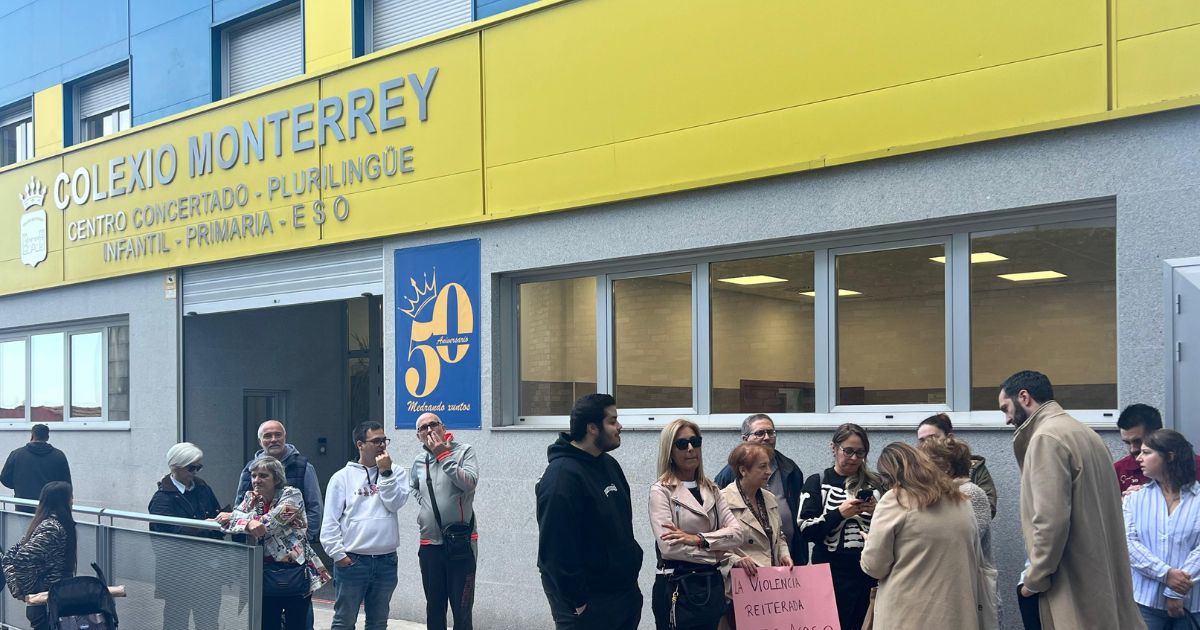 Decenas de personas se concentraron este viernes en el exterior del colegio vigués Monterrey, en Teis. Los padres relatan los hechos.