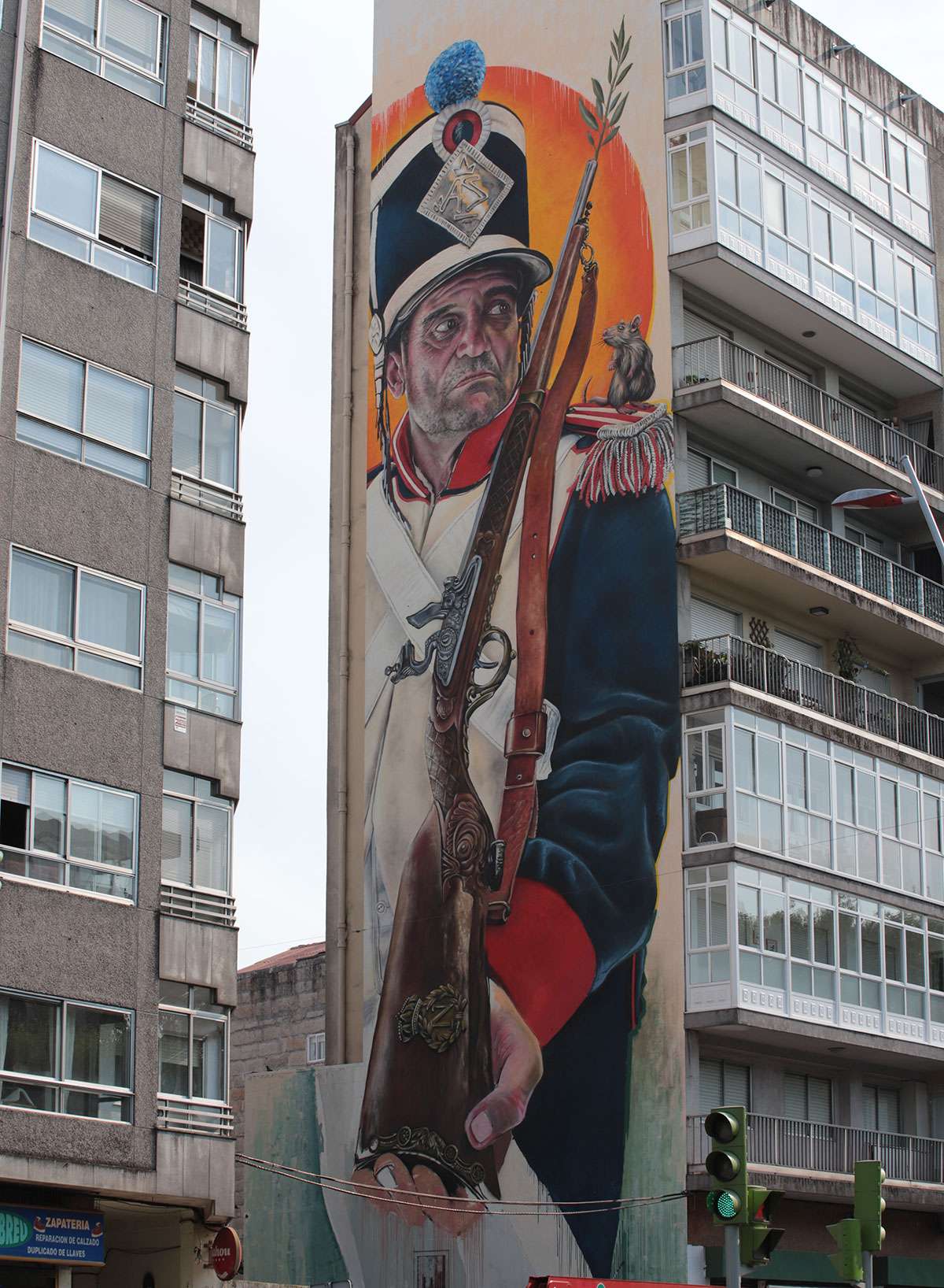 El de Vigo es un mural especial en la trayectoria del artista ya que es el de mayor altura que ha pintado al superar ampliamente los 30 metros. Diego Anido Seijas, conocido como Diego AS, buscaba plasmar en la fachada un hecho histórico en la ciudad, simbolizando además la paz. "Quería que el concepto de una invasión quedara plasmado señalando que es algo que no puede estar pasando en pleno siglo XXI como sucedió hace no tanto en Vigo", explica para apuntar que la elección de un francés genera cierta "controversia" porque ha elegido precisamente al invasor.