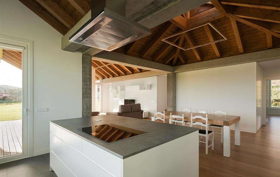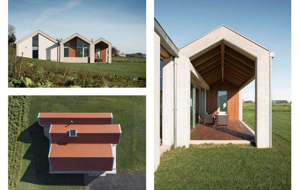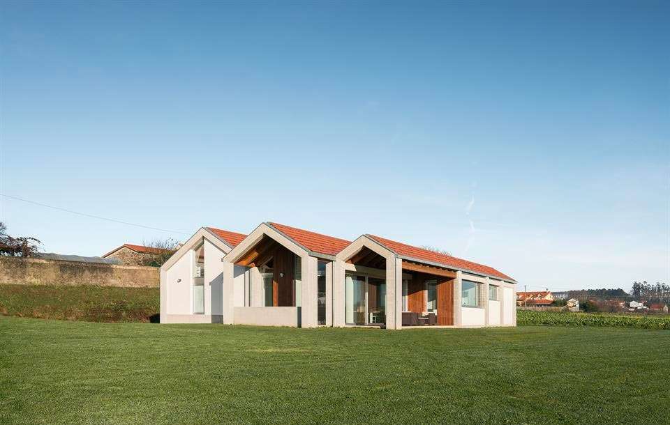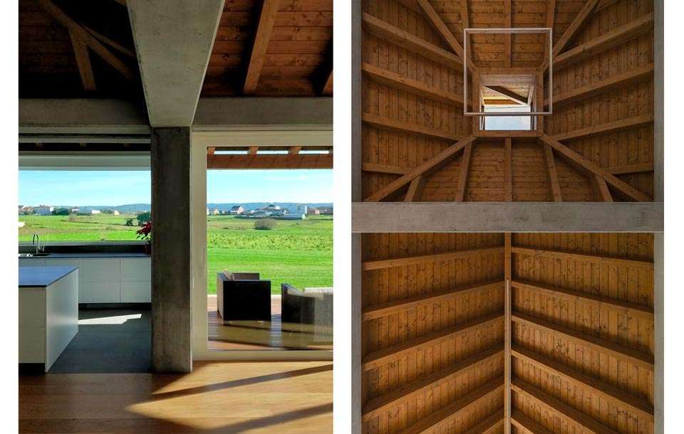 La primera decisión de proyecto fue “realizar la integración a través de un diálogo directo y sincero con la arquitectura del trabajo”, en la que de alguna manera sobrevivieron parte de los principios que regían la arquitectura tradicional de las “agras”. La vivienda se levanta en una única planta que configura espacios cuadrados y rectangulares en diferentes proporciones. Alberga vivienda y un espacio de garaje/taller, donde casa y espacios de trabajo coexisten bajo una misma cubierta con zonas abiertas y cubiertas previas los accesos.