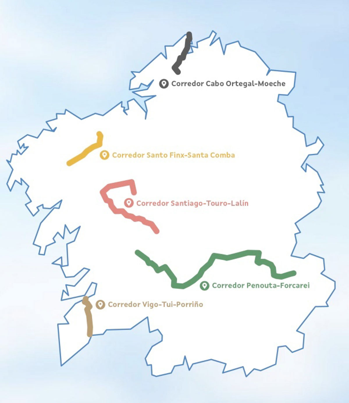 Los corredores son Santiago-Touro-Lalín, con cobre, cobalto, zinc, galio, germanio, indio; Cabo Ortegal-Moeche, con cromo y elementos del grupo del platino; Penouta-Forcarei, con tantalio, niobio, litio, estaño; San Finx-Santa Comba, con wolframio, estaño y bismuto y Vigo-Tui-Porriño, con tierras raras.