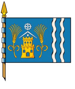 La bandera diseñada guardia coherencia con el escudo e incorpora los mismos elementos principales: fondo azul, torre amarilla entre dos espigas de la mismo color, compás, chumbada, rueda dentada en blanco en la parte superior y, a los lados, dos franjas verticales y oleajes de blanco en alusión al río Louro.