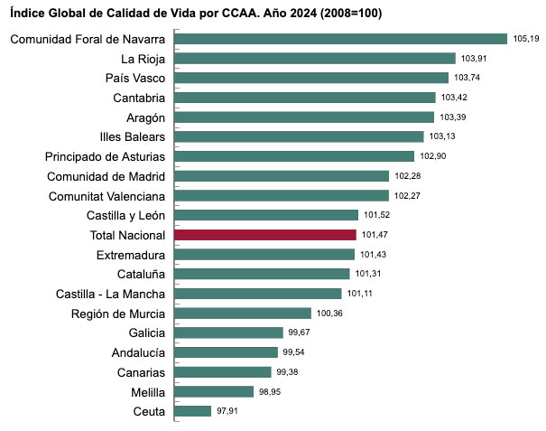 Este indicador otorga a Galicia 99,67 puntos, dos por debajo de la media española (101,47 puntos), ocupando así el tercer peor dato. Solo está por encima de Canarias (99,38) y Andalucía (99,54). En el otro otro extremo, Navarra (105,19), La Rioja (103,91) y País Vasco (103,74) presentaron los niveles más elevados de calidad de vida en el año 2024.