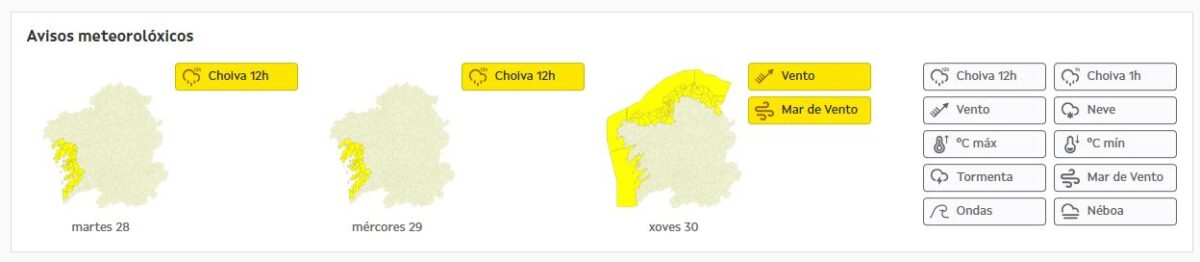 MeteoGalicia, además, ha activado una alerta amarilla para el próximo jueves en toda la costa de las Rías Baixas, incluido Vigo, por fuertes rachas de viento en el mar. Se esperan vientos de suroeste de fuerza 7 entre las 12:00 y las 21:00 horas de este jueves 30 de octubre.