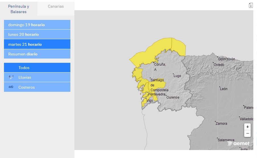 La Agencia Estatal de Meteorología ha activado para el próximo martes, 21 de octubre, un aviso amarillo por fuertes precipitaciones en diferentes puntos de la provincia de Pontevedra, entre ellos Vigo. Así, la ciudad olívica, según notifica la AEMET en las últimas horas, estará en alerta por intensas precipitaciones en la segunda jornada de la semana. Se prevén acumulados de 40 litros por metro cuadrado en 12 horas. En concreto estas intensas lluvias se prevén entre la medianoche del lunes y las 10:00 horas del martes