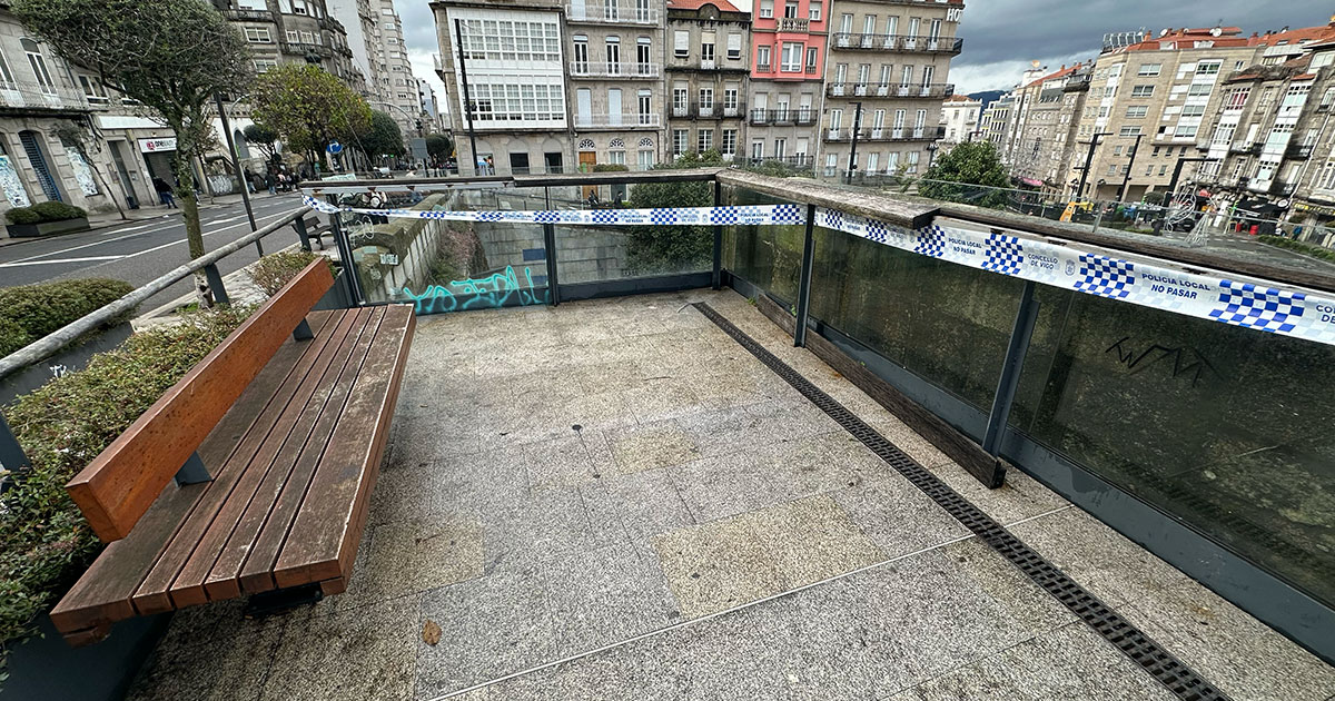 Apenas han pasado cuatro años desde que se inaugurara y ya ha tenido que ser precintado por el peligro que supone para los ciudadanos. La Policía Local de Vigo ha delimitado buena parte del mirador de la calle Urzáiz, hacia Vialia, después de que diversos elementos se desprendieran por su mal estado.