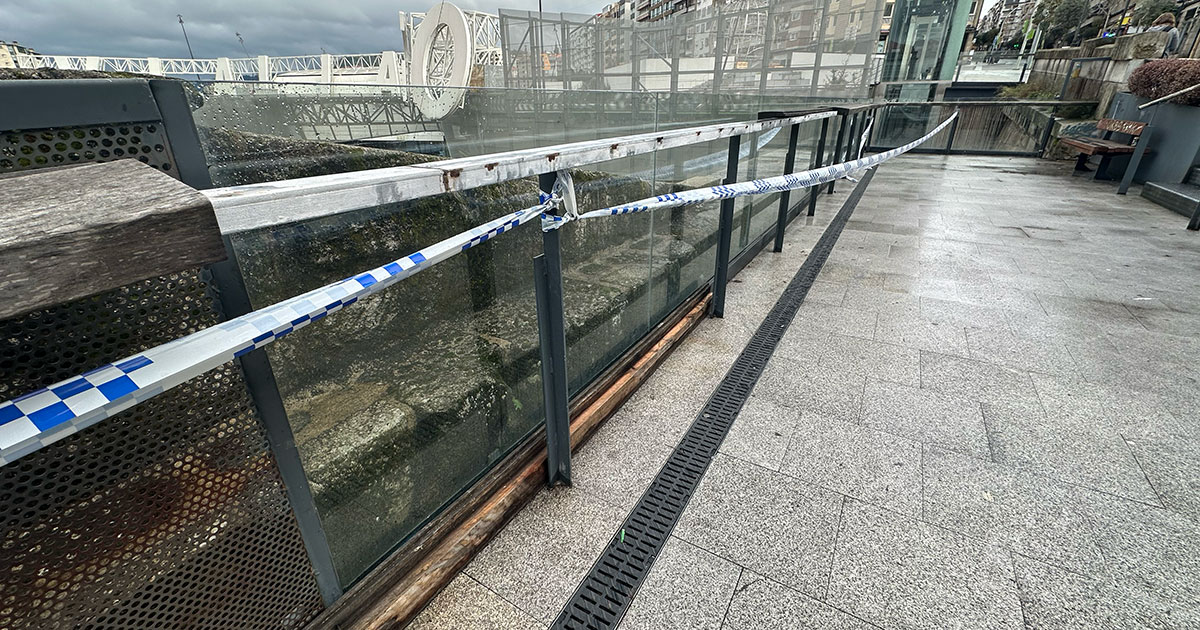 Así, buena parte del pasamanos ha acabado ya en el suelo, dejando al aire la sujeción metálica sobre la que se encontraba instalado. Las partes que todavía se mantienen ancladas muestran un estado de mantenimiento cuestionable, al que posiblemente no ayuda una elección de material poco acertada para las inclemencias al aire libre. Por ahora, y a la espera de que se sustituya, todo el pasamanos está precintado.