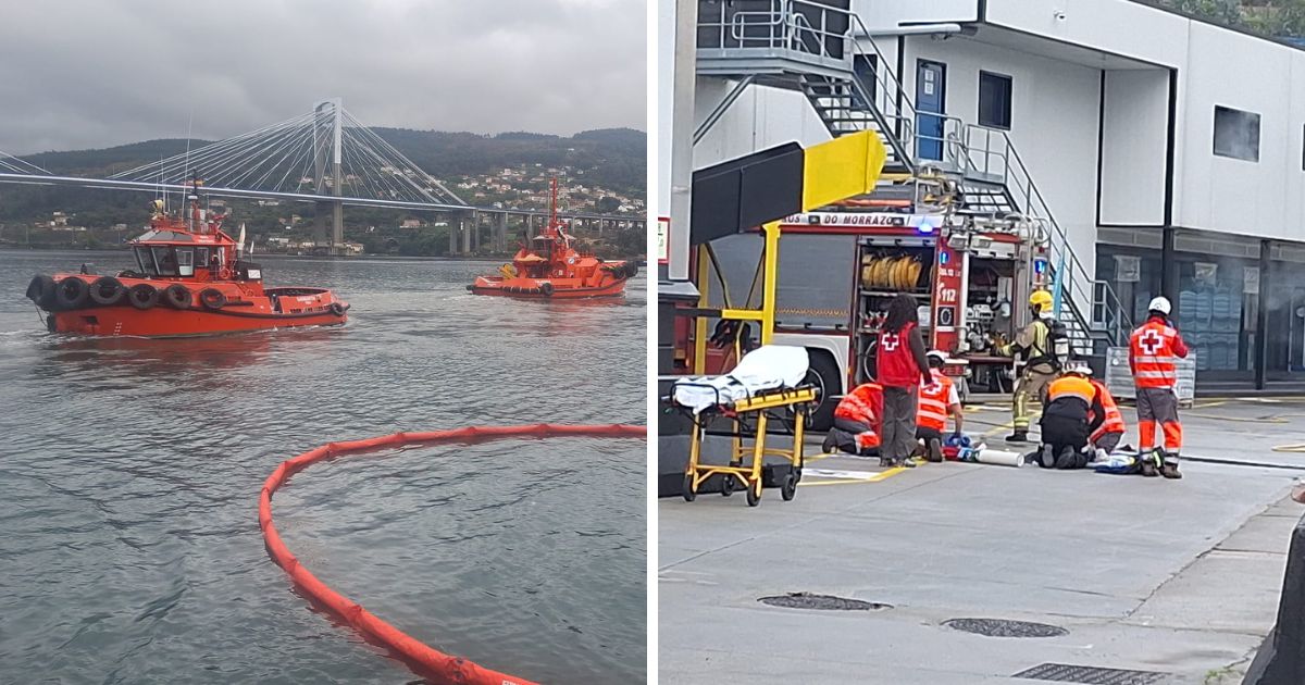 El escenario simulado abarcó un incendio no controlado con abundante humo, lo que conllevó la evacuación de heridos. Además, se incluyeron simulaciones adicionales críticas, como una amenaza de fuga de amoníaco y un vertido contaminante al mar, para el cual se analizó la deriva con cajas de poliespán y se puso a prueba la protección de la zona de bateas.
