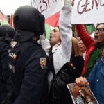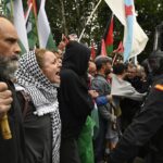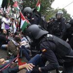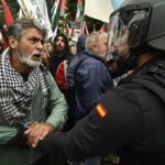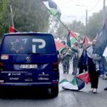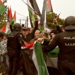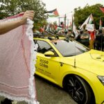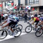 La polémica arrancó mucho antes de que comenzase está 16ª etapa de La Vuelta. Organizaciones propalestinas difundían un vídeo de operarios en Mos tapando las banderas de Palestina pintadas en el asfalto. Se preveía una jornada larga, y así fue. Las pancartas también fueron una constante, con lemas como "La Vuelta patrocina el genocidio en Palestina", "Cómplices" o "Palestina vencerá".