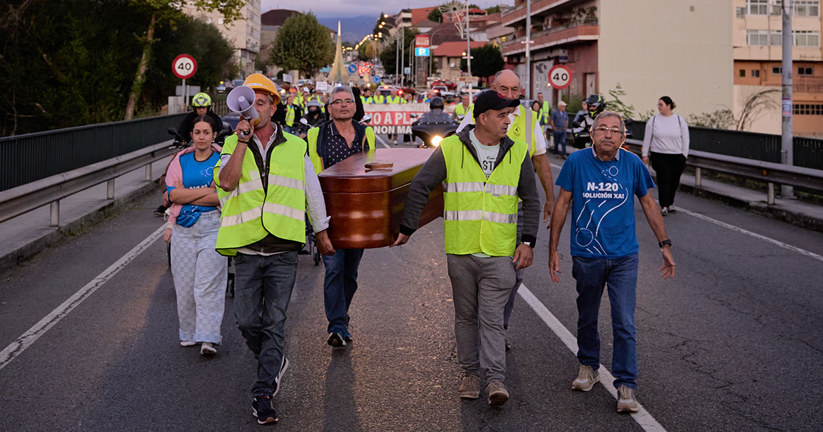 Durante una hora, entre las 19:30 y las 20:30 horas, los participantes portaron pancartas, chalecos reflectantes y dando continuidad a acciones simbólicas que vienen realizando en las últimas semanas. La semana pasada, la movilización contó con la presencia de un coche fúnebre que trasladó un ataúd hasta la rotonda del monumento a los alfombristas (a la altura de la N-120 cuando cruza con la carretera de Mondariz).