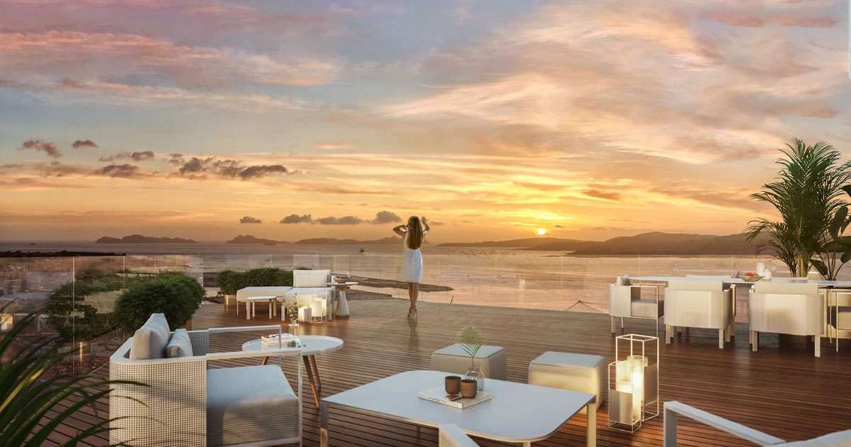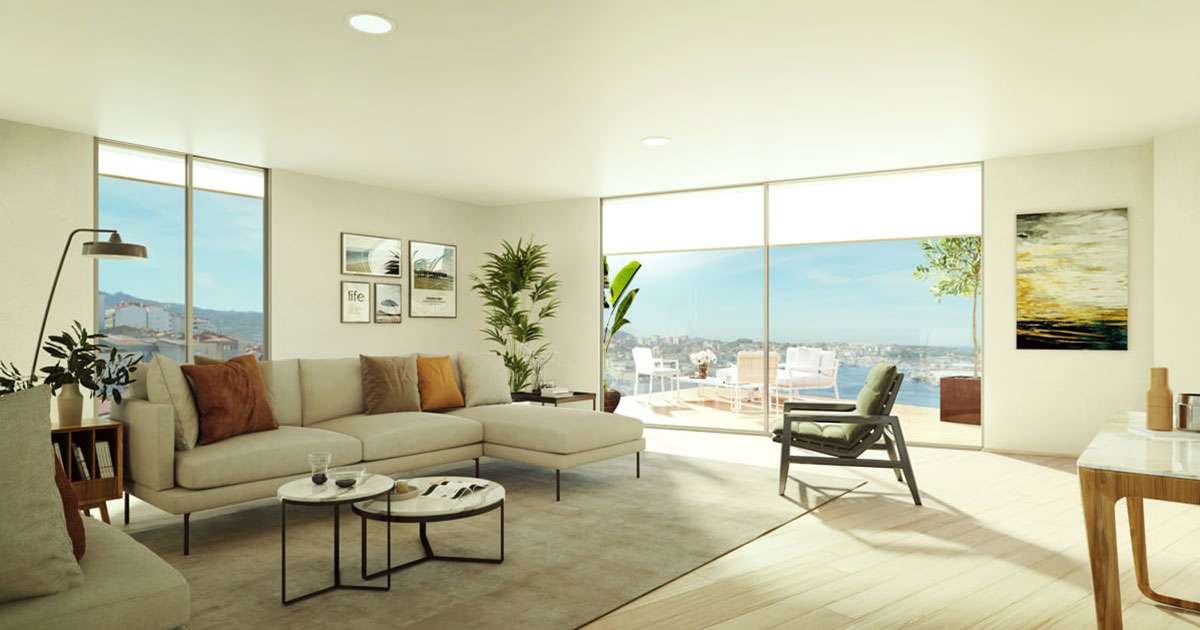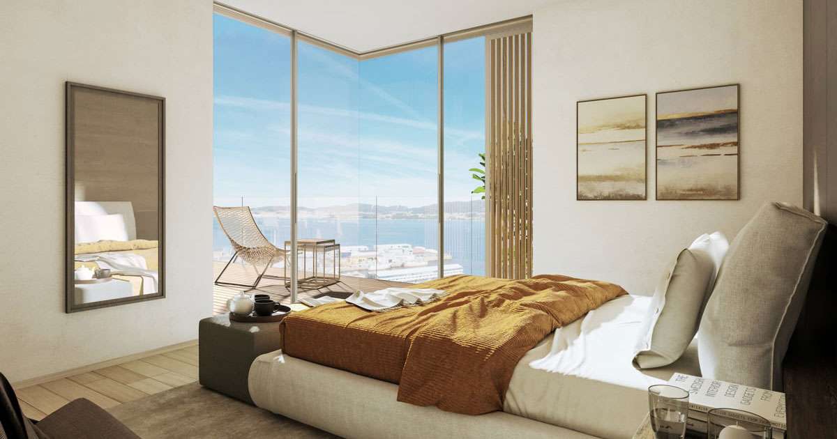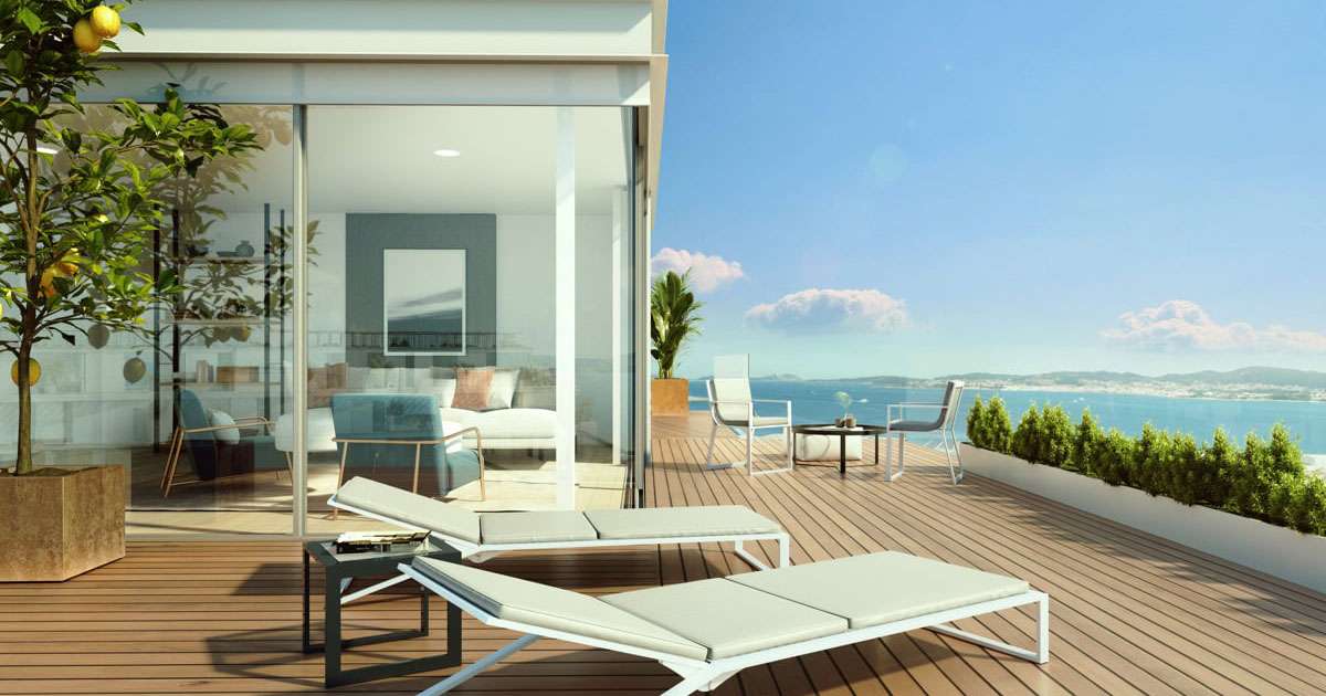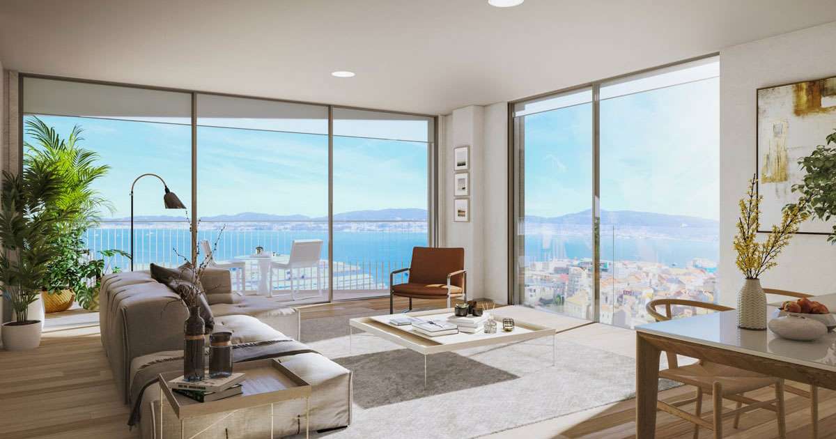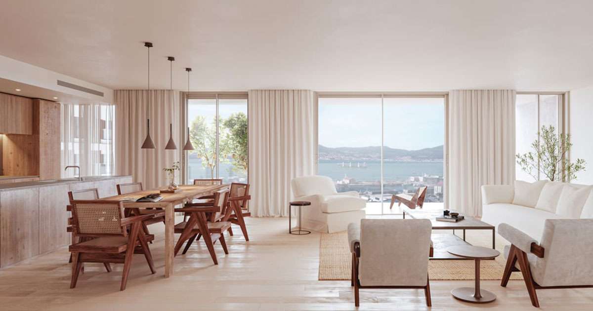 El edificio de mayor tamaño será “Lúa”, que conforma junto a Estrela la plaza mirador abierta al mar. Se proyecta en forma de “L” para levantar hasta nueve alturas en las que se distribuirán 118 viviendas, la mayoría con terraza. En su parte baja estarán las zonas comunes de todo el complejo con gimnasio, zona deportiva con pistas de pádel, piscina climatizada, etc. Los pisos rondarán entre los 145 metros de una vivienda de dos dormitorios con terraza hasta los 223 metros cuadrados de una con cuatro dormitorios y terraza.