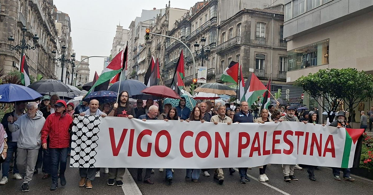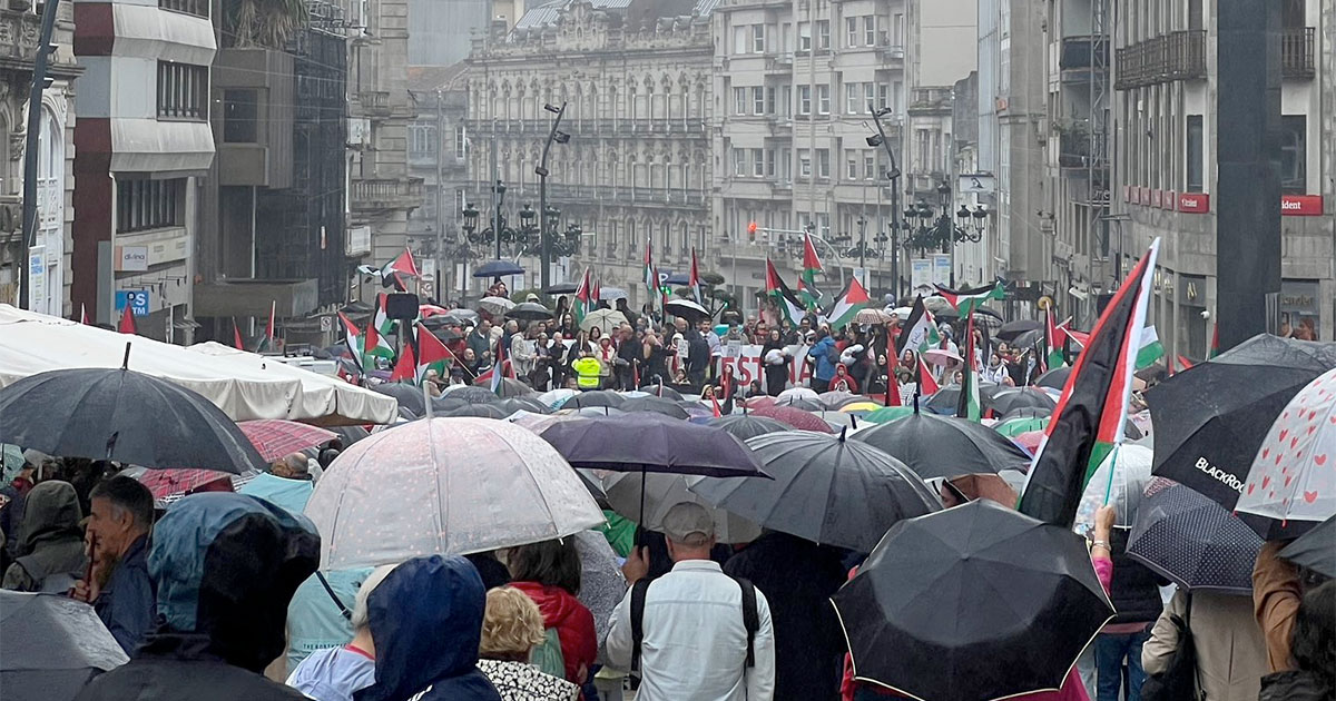 Miles de personas han vuelto a salir a la calle en Vigo par denunciar el genocidio en Gaza e insistir en que "la causa de Palestina es la causa de la humanidad". Tras la concentración del pasado jueves en el Paseo de Alfonso, esta vez se convocó una manifestación que partió de Vía Norte y acabó en Porta do Sol, logrando una amplia participación que venció a la lluvia para lanzar un grito de apoyo a la población civil de Palestina.