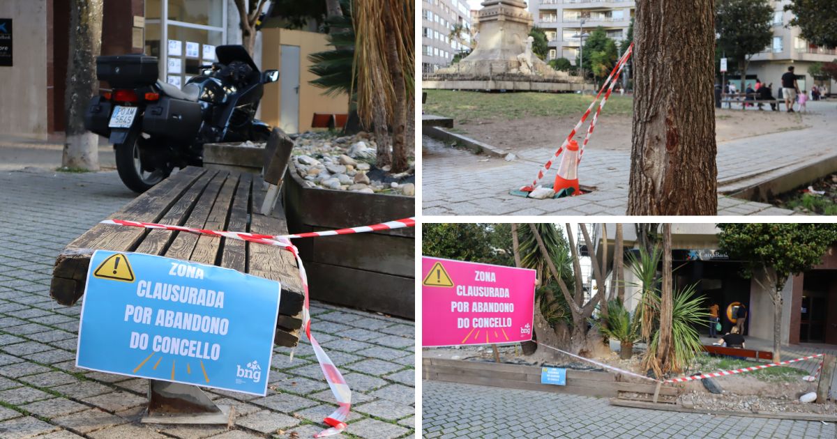 El Bloque Nacionalista Gallego denuncia el "total abandono" de la Praza Independencia de Vigo. El frente nacionalista acaba de realizar una acción simbólica, precintando algunos de los elementos deteriorados que presenta este espacio, para hacer visible el "abandono y falta de gestión" del Gobierno municipal con el mantenimiento de los espacios públicos.