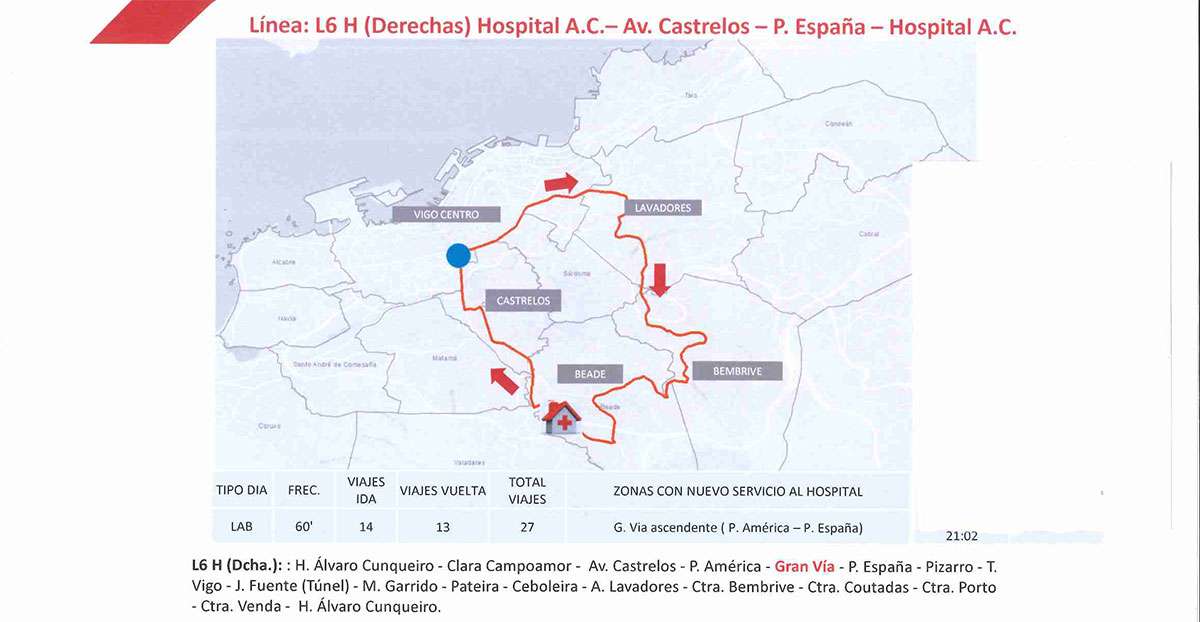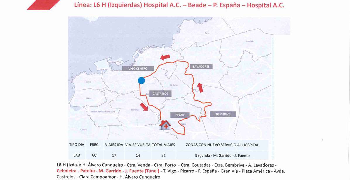 L12B | Esta línea también llegaba en la actualidad a la puerta principal y consultas del Álvaro Cunqueiro. Según apunta el Concello, se “readaptarán” los horarios a petición de los trabajadores. Además, la ruta eliminará su recorrido por Matamá para conectar directamente por la Avenida Clara Campoamor.