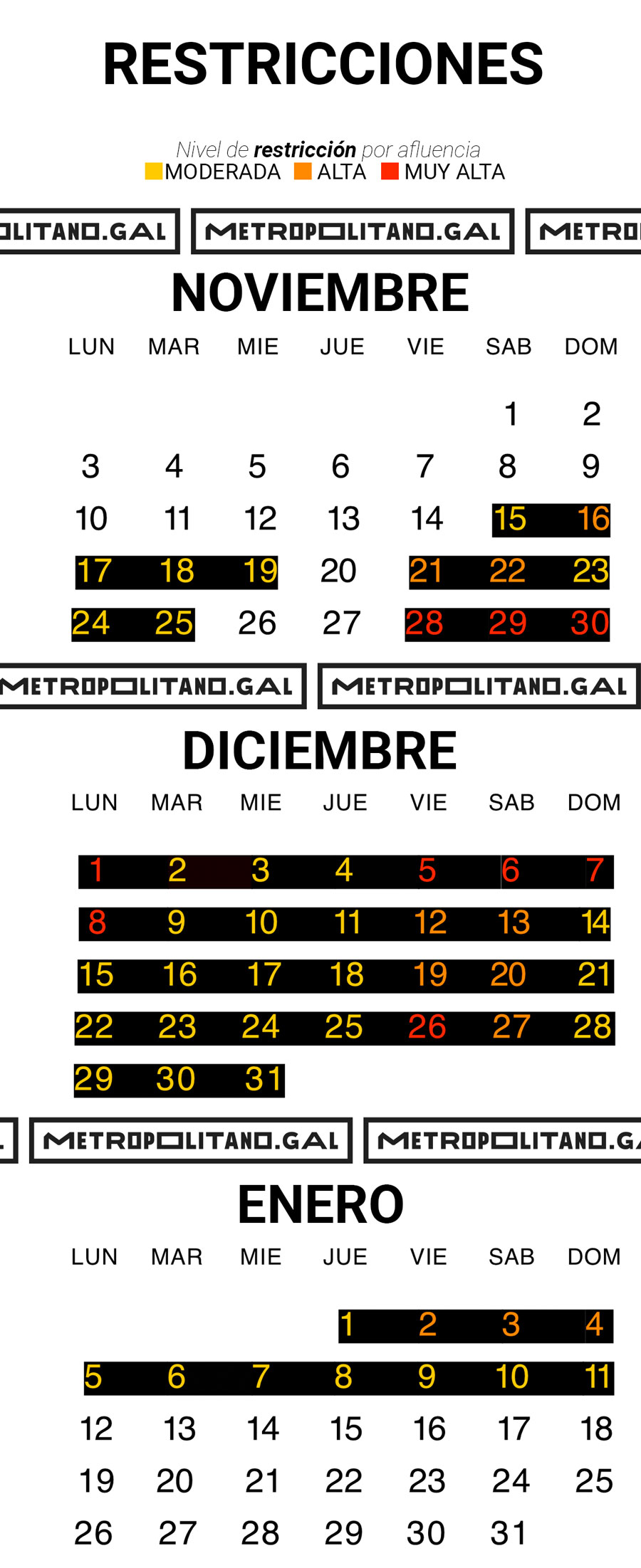 El primer día de las restricciones tendrá lugar este sábado, 15 de noviembre, día del encendido del alumbrado. Finalizarán el 11 de enero, cuando previsiblemente se apaguen las luces. Entre medias, todos los días habrá algún tipo de medida especial, a excepción del 20, 26 y 27 de noviembre.