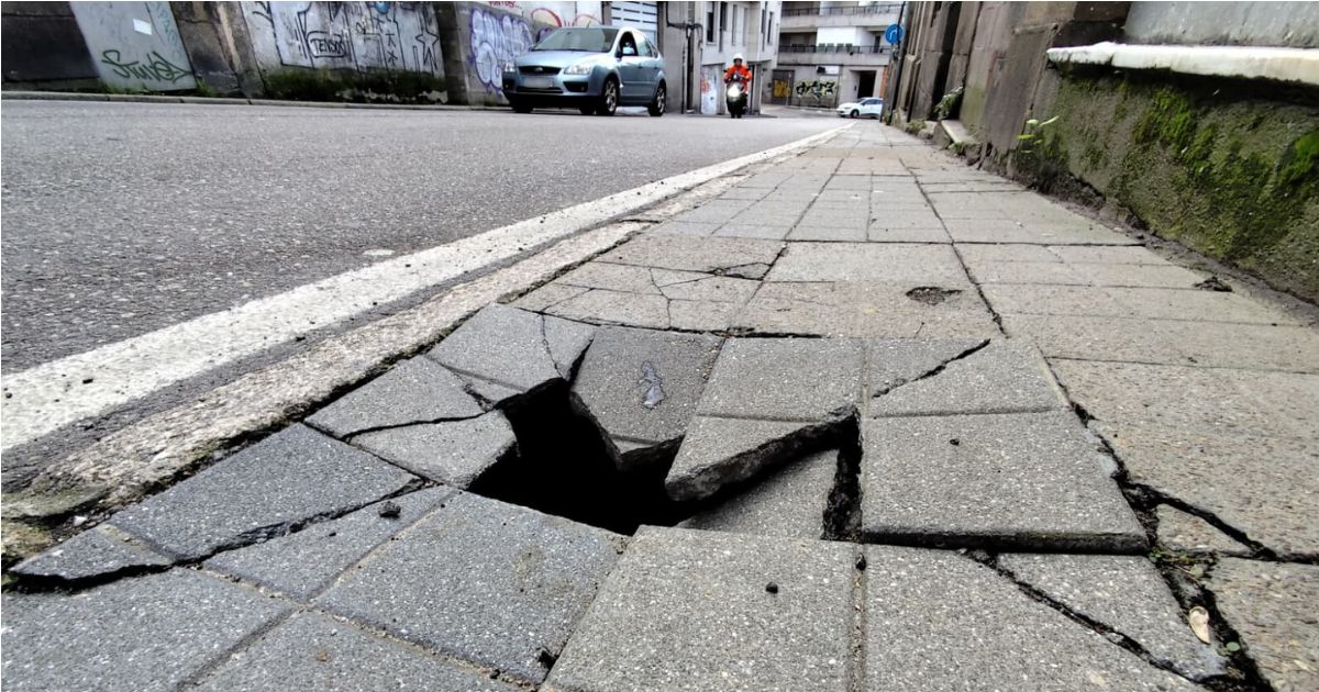 Un nuevo obstáculo en una de las vías más peligrosas del centro de Vigo. Si hace poco más de un mes los vecinos y vecinas se quejaban del mal estado de la calle Llorente, ahora el empeoramiento de la situación les da la razón por completo. Este mismo miércoles, la acera se ha venido abajo para sorpresa de los viandantes.