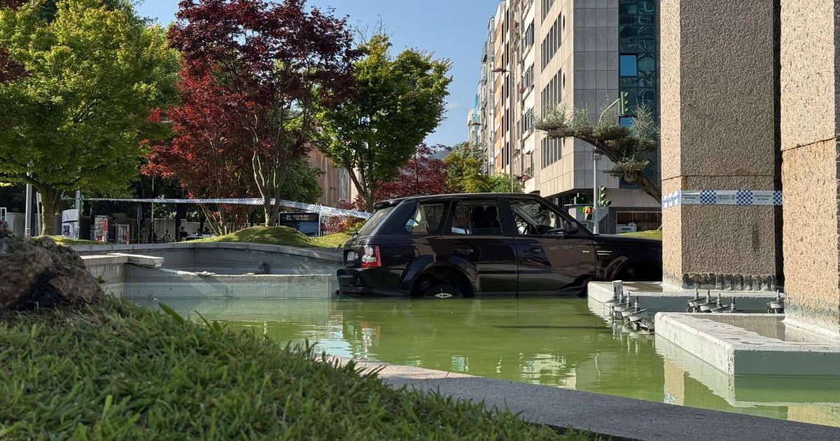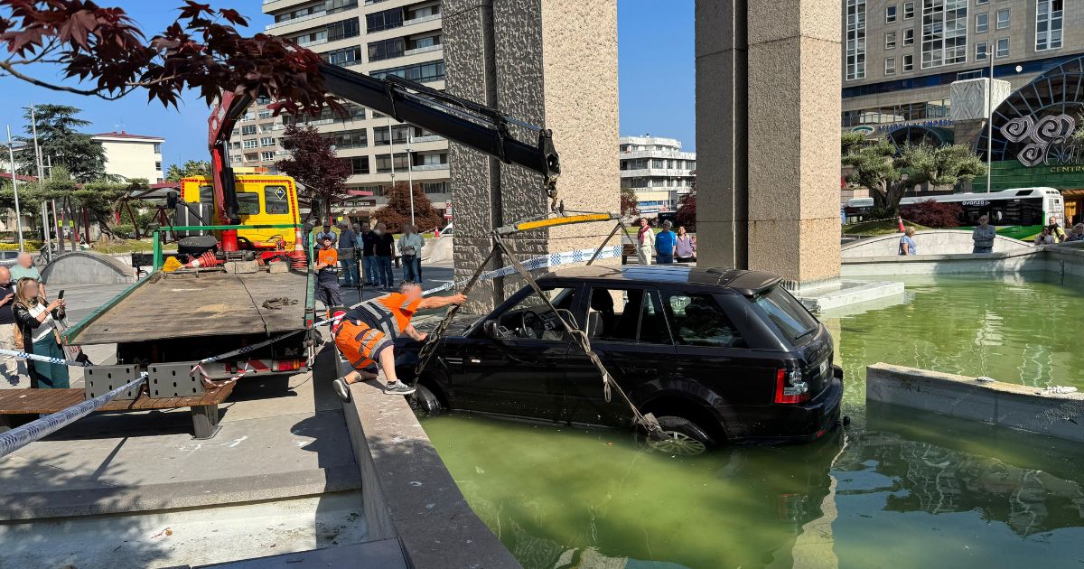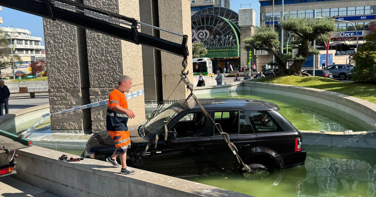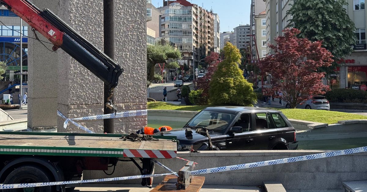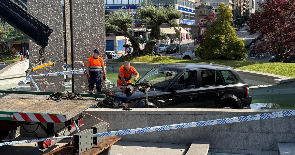 Insólito inicio de semana en Vigo. Si hace no demasiado los vigueses y las viguesas tomaron Praza América para zambullirse en una épica celebración por el cierre de la temporada del Celta, ahora es el turno de un todoterreno. A primera hora de este lunes, los vecinos y vecinas de la zona han amanecido con esta sorprendente imagen, la de un coche empotrado contra uno de los estanques de esta icónica plaza.
