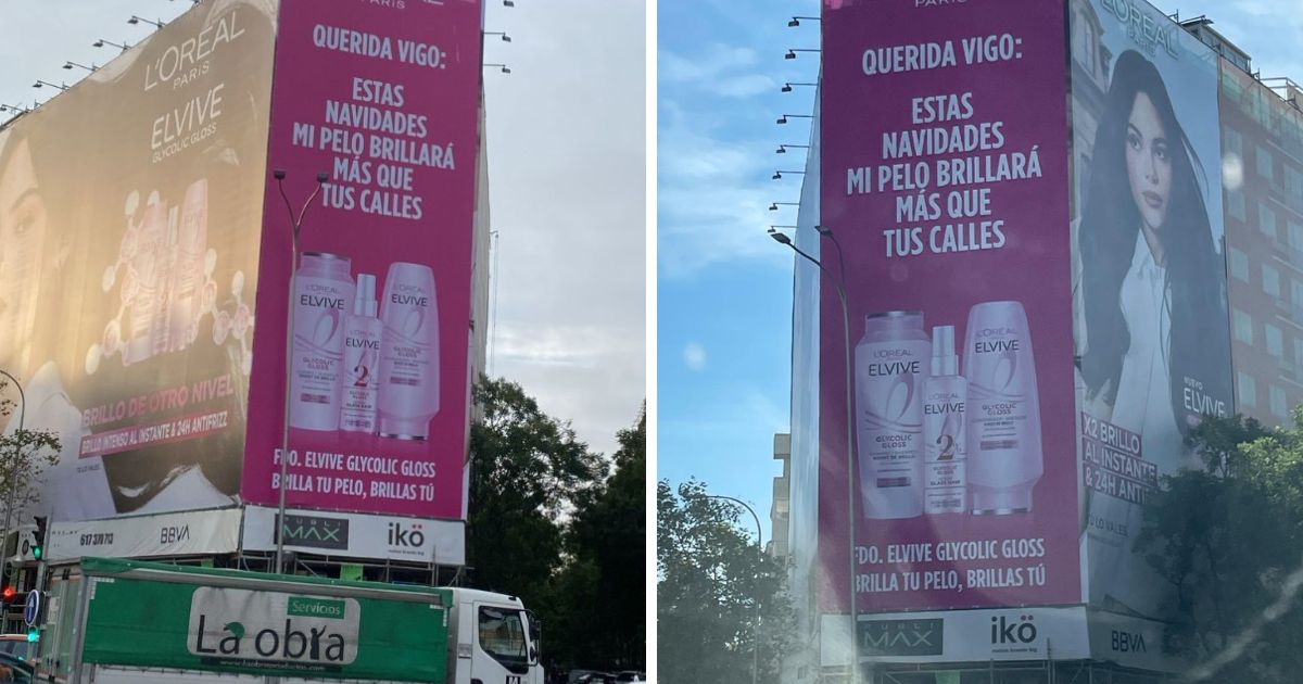 "Querida Vigo: estas navidades mi pelo brillará más que tus calles", con este mensaje ha cubierto L'Oreal todo un edificio en la madrileña Avenida de América para presentar su último producto. Un claro guiño a las luces de la ciudad, que ya son una referencia más para la sociedad en España. Y así lo interpreta la multinacional francesa de la cosmética, que no ha dudado en utilizar la popularidad que ha logrado Vigo con su Navidad en este mensaje promocional en un tono de humor.