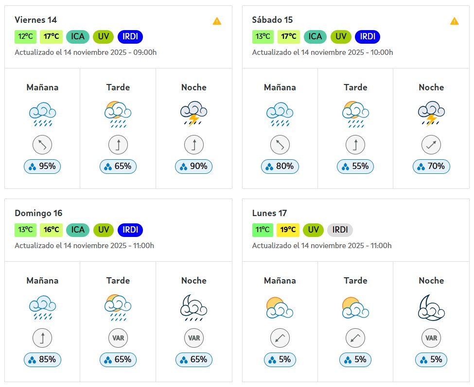 Eso sí, MeteoGalicia informa de que la próxima semana se espera cambio de tiempo con la entrada de una masa de aire fría, vientos del norte y bajada de temperatura. Señala que para entonces es posible la entrada de un anticiclón con tiempo más seco.