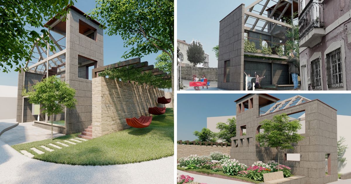 La propuesta pasa por mantener el edificio, que destaca por su particular torre de piedra, jugando con el carácter “evocador” de las ruinas, recuperando el inmueble y creando un diálogo con el exterior a través de un cuidado ajardinamiento.