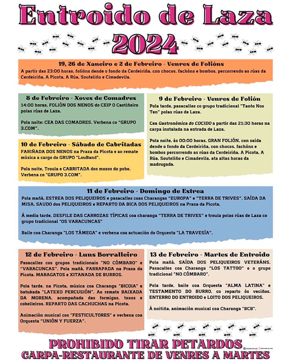 Este año, el Entroido de Laza, declarado Festa de Interese Turístico de Galicia, será uno de los primeros en darle el pistoletazo de salida a su programación festiva con los Venres de Folións, que arrancarán este mismo viernes 19 de enero y se celebrarán también el 26 de enero y el 2 de febrero. La fiesta continuará a partir del 8 de febrero con el Xoves de Comadres, mientras que el 9 de febrero tendrá lugar el Venres de Folións con pasacalles, cena gastronómica do Cocido y un Gran Folión por la noche.