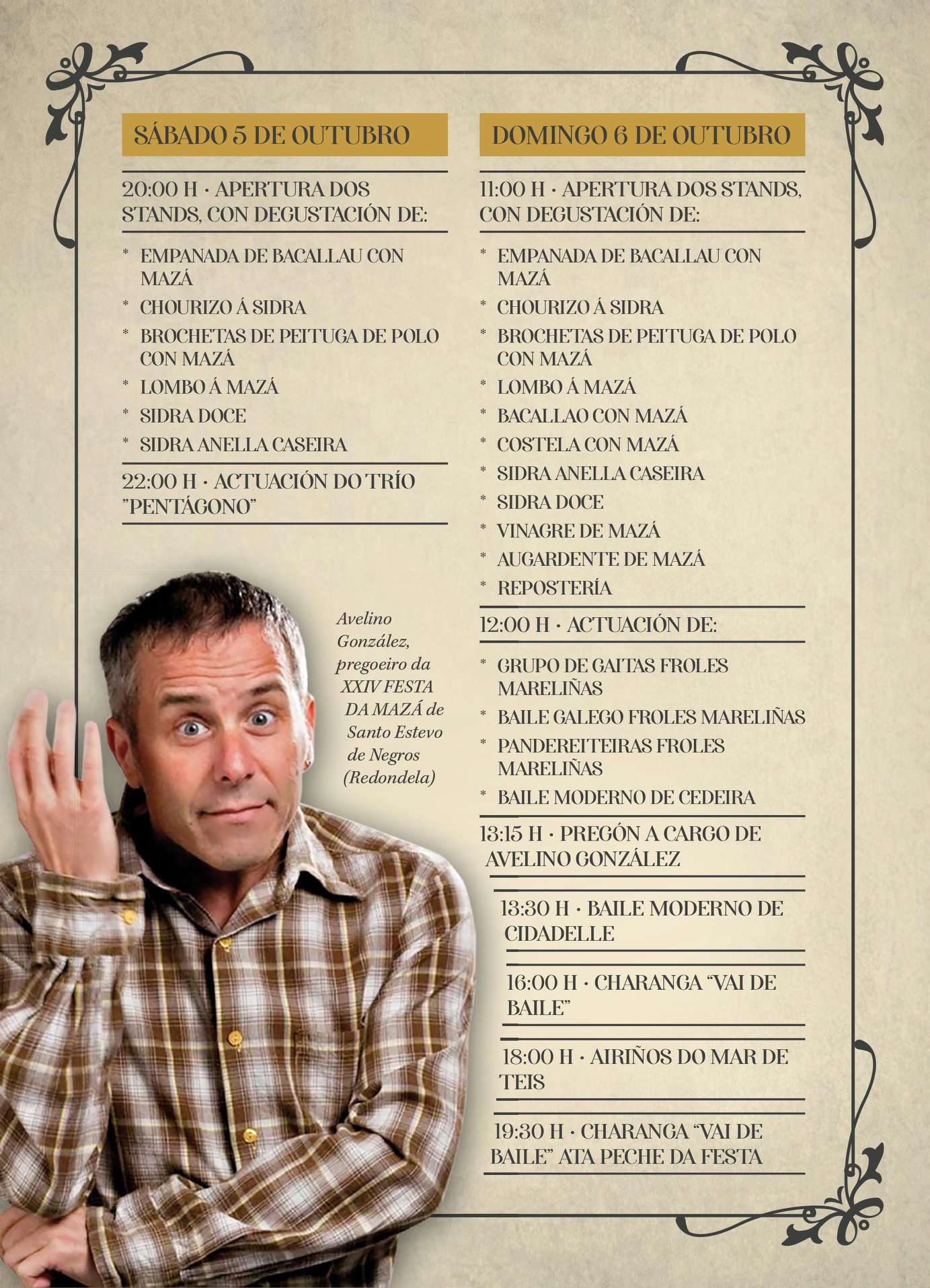 Aunque el sábado se celebrarán actuaciones musicales desde las 20:00 horas, los puestos de venta y degustación abrirán el domingo 6 a partir de las 10:30 horas. Será esa jornada cuando se celebre un concurso de sidra y repostería con manzana a partir de las 12:00 horas. A partir de las 13:00 horas arrancará la lectura del pregón a cargo del maestro gaiteiro Antón Corral y la entrega de premios del concurso. También se entregará la IX Mazá de Ouro.