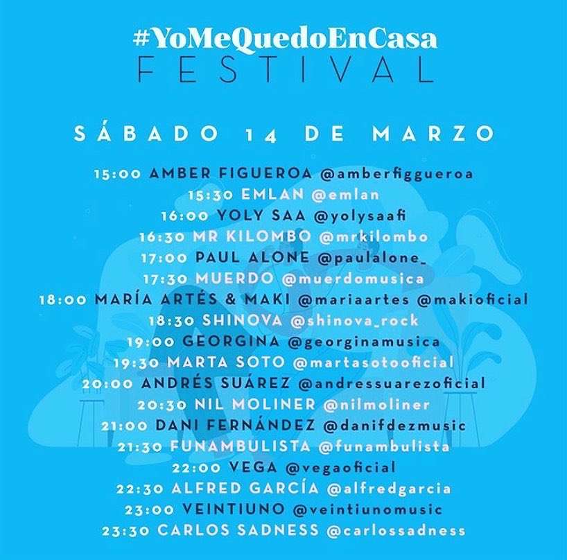 Hasta este domingo podrás disfrutar del primer festival que se celebra a través de Instragram. Artistas de primer nivel ofrecerán conciertos gratuitos de 30 minutos en sus respectivos perfiles oficiales. Para estar al tanto de cada uno de ellos, debes seguir la cuenta @yomequedoencasafestival. Desde el perfil oficial de instagram de cada artista o grupo. Este sábado podrás disfrutar, entre otros, de Andrés Suárez (20:00h), Funambulista (21:30h), Vega (22:00h), Alfred García (22:30h) o Carlos Sadness (23:30h).