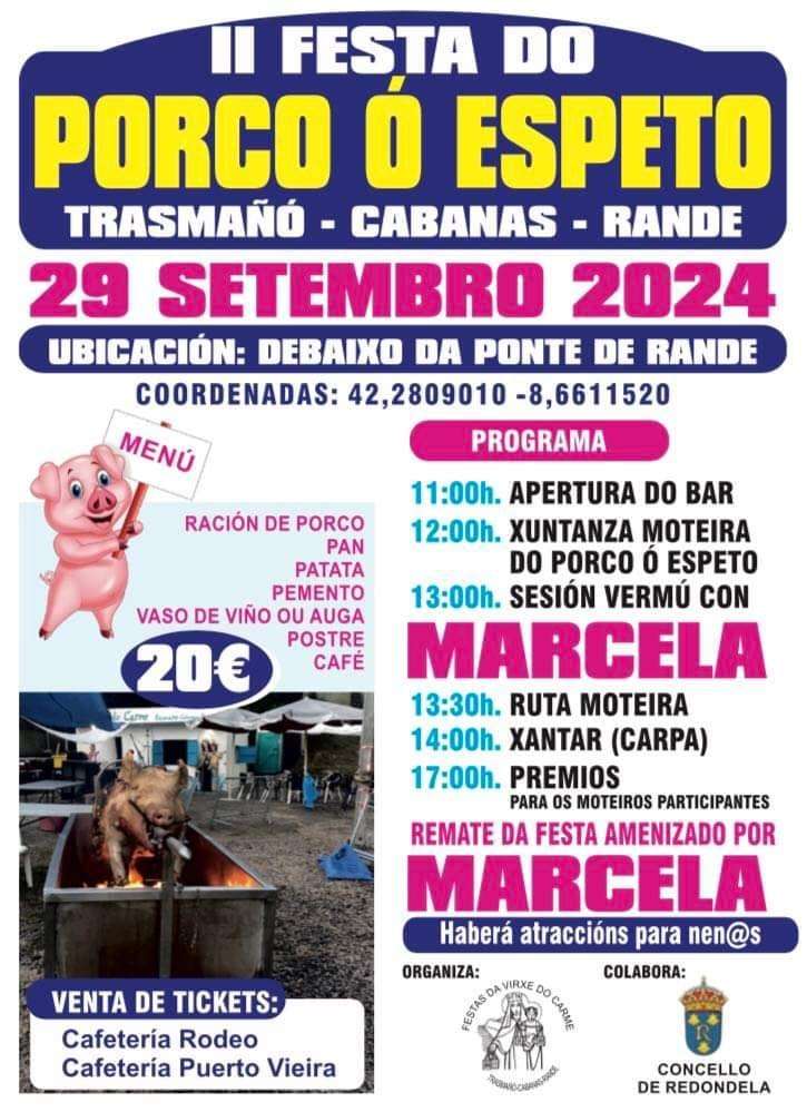 En Trasmañó (Redondela), la segunda edición de la fiesta dedicada a este manjar gastronómico se celebrará el domingo 29 debajo del puente de Rande y ofrecerá un menú a 20 euros que incluye la ración de cerdo, pan, patata, pimiento, vaso de vino, postre y café. Los tickets se venden en la cafetería Rodeo y Puerto Vieira. Incluirá programación musical a lo largo del día y atracciones para niños.