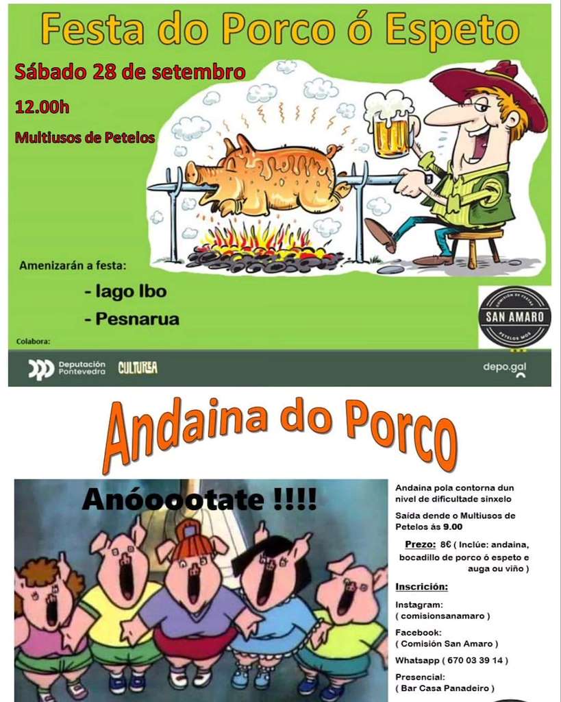En Mos, la cita será el sábado 28 en el Multiusos de Petelos a partir de las 12:00 horas. La comisión de San Amaro organiza una andaina por el entorno con salida a las 9:00 horas para abrir apetito. El precio de 8 euros incluye la andaina, el bocadillo de cerdo al espeto y agua o vino. Los interesados pueden escribir al WhatsApp 670 033 914.
