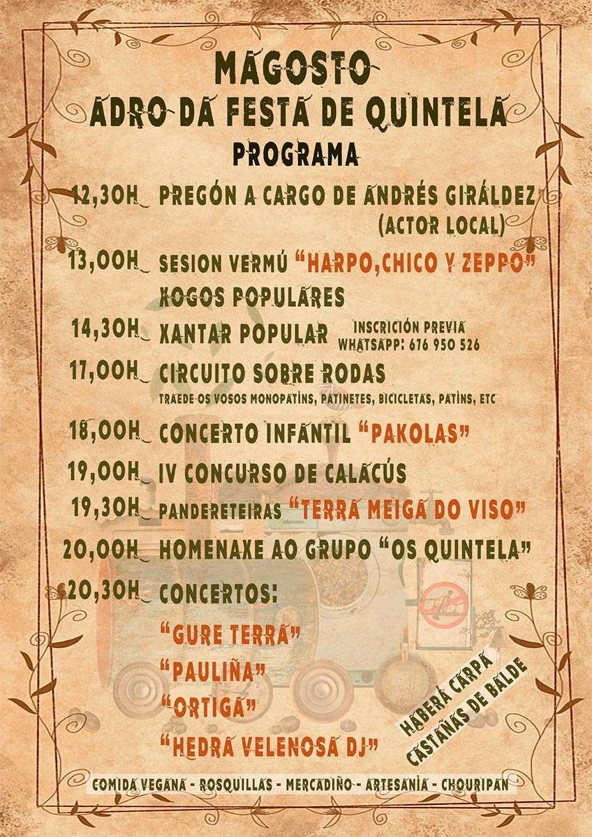 El área de Vigo continúa celebrando la temporada de castañas. Este fin de semana es el turno de Cangas y Redondela, que ponen en marcha dos magostos con una amplia programación. En el caso de Redondela, este sábado tendrá lugar el IV Magosto Sinha Paca en el Adro da Festa de Quintela. La fiesta arrancará a las 12:30 horas con el pregón a cargo del actor local Andrés Giráldez, que dará paso a una sesión vermú amenizada por "Harpo, Chico y Zeppo”. Por la tarde, a las 17:00 horas, se podrá participar en un “circuito sobre ruedas” y a las 18:00 horas pequeños y mayores podrán disfrutar del concierto infantil de “Pakolas”. A las 19:00 horas tendrá lugar el IV Concurso de Calacús y a las 19:30 horas arrancará la programación musical con la actuación del grupo de pandeireteiras “Terra Meiga do Viso” y un posterior homenaje al grupo “Os Quintela”. Por último, a las 20:30 horas tendrá lugar el plato fuerte del Magosto Sinha Paca con los conciertos de “Gure Terra”, “Pauliña”, “Ortiga” y “Hedra Velenosa Dj”. Además, durante la jornada habrá castañas gratis, comida vegana, choripán, rosquillas y artesanías.