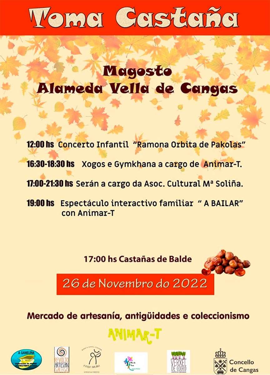 Por su parte, el “Toma Castaña” de Cangas tendrá lugar en la Alameda Vella de Cangas y comenzará a las 12:00 horas con el concierto infantil “Ramona Orbita” de “Pakolas”. Por la tarde, entre las 16:30 y las 18:30 horas habrá juegos y una “gymkhana” a cargo de Animar-T. Posteriormente, de 17:00 a 21:30 horas arrancará el “serán” de la mano de la Asociación Cultural Mª Soliña. Las castañas gratuitas se repartirán a partir de las 17:00 horas y además habrá un mercado de artesanía, antigüedades y coleccionismo.