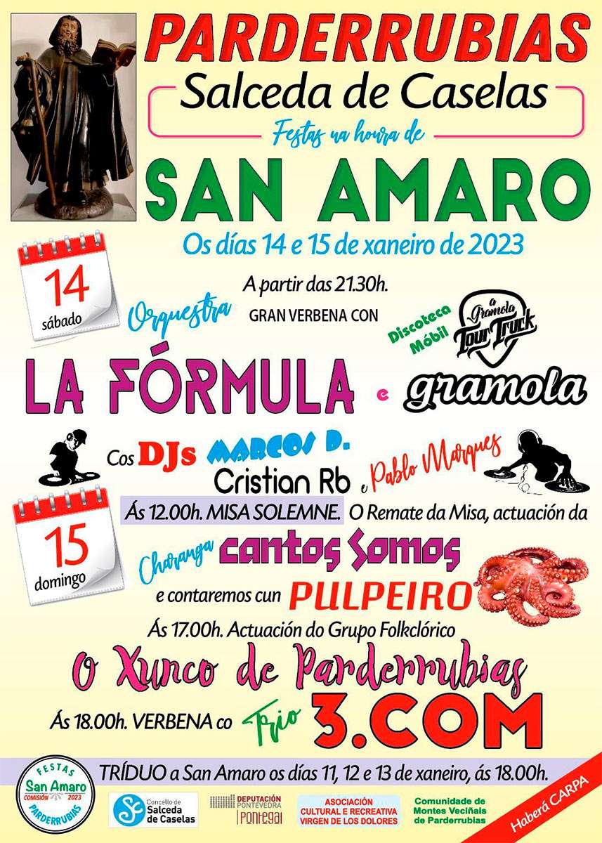 En el caso de Salceda de Caselas, la parroquia de Parderrubias ya se prepara para dos jornadas de fiesta dedicadas a San Amaro, que empezarán el sábado 14 de enero con un Gran Verbena a cargo de la orquesta La Fórmula y la discoteca móvil Gramola. Además, la velada también estará amenizada por los Djs Marcos D., Cristian Rb y Pablo Marques. El domingo, después de la misa, habrá pulpeiro y se podrá disfrutar de la charanga Cantos Somos. A las 17:00 horas tendrá lugar la actuación del Grupo Folkclórico O Xunco de Parderrubias y a las 18:00 horas comenzará la verbena con el Trio 3.com.
