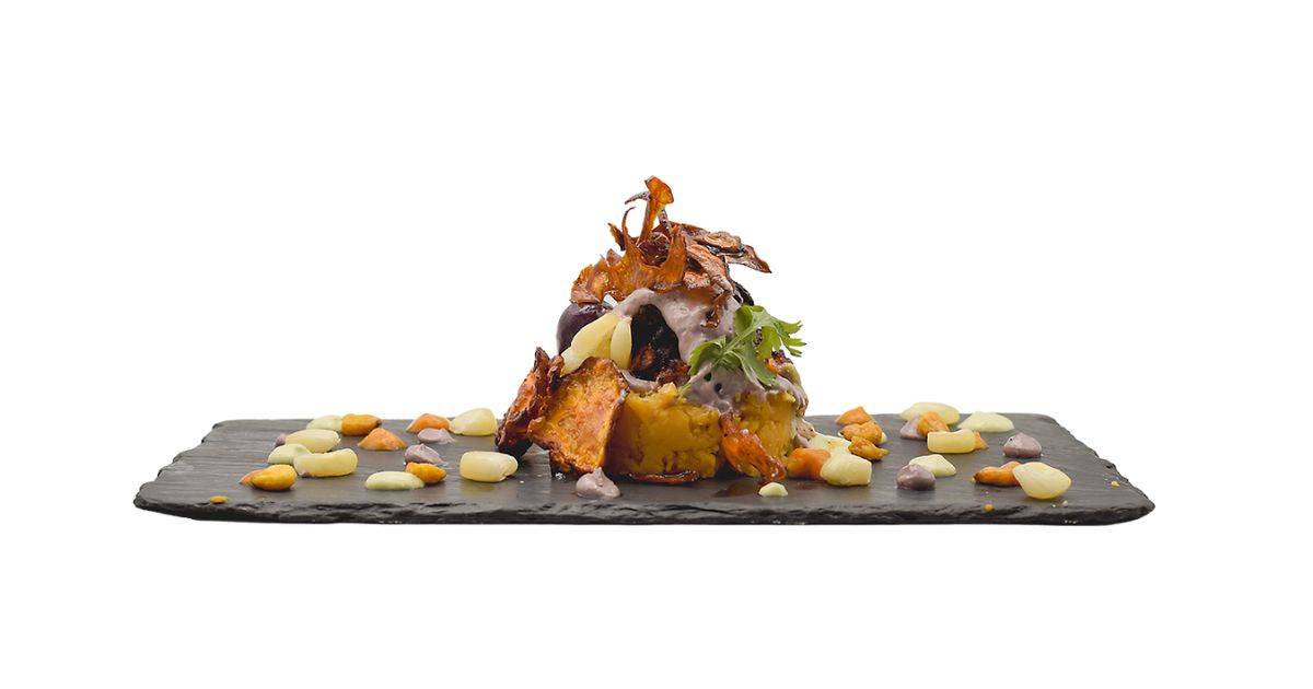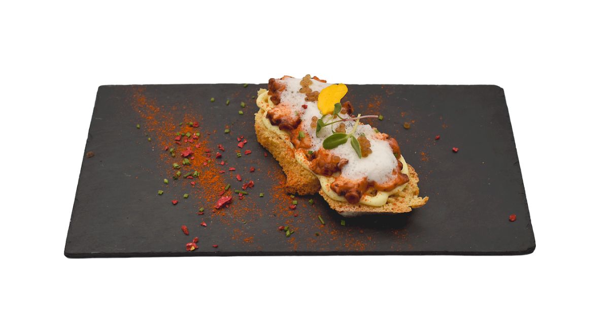- Ingredientes: Pulpo, patata, nata, pan de maíz, trufa, AOVE, pimentón de la vera, albariño y tinta de calamar