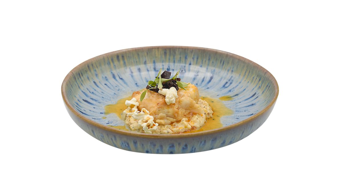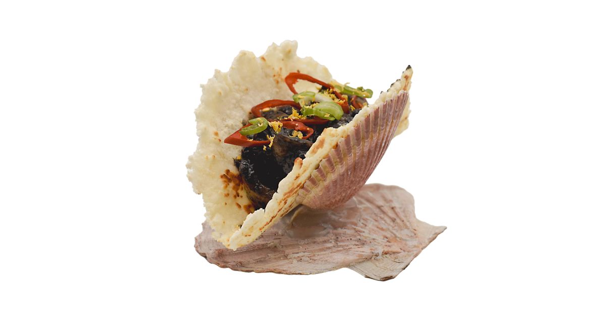 - Ingredientes: Snack de arroz tintado, pastel de merluza, pil-pil de ajo, alga kodium en polvo.