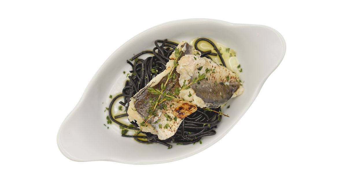 - Ingredientes: Merluza, espaguetis nero di sepia, ajo, tomillo limonero, guindilla, fumé de pescado y mariscos