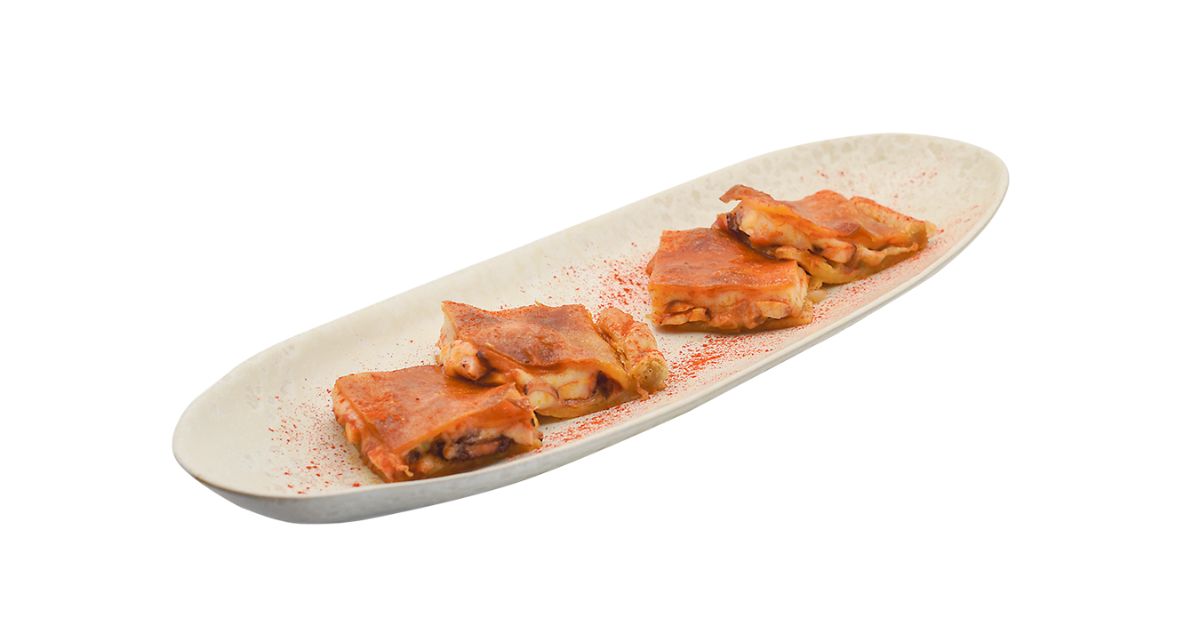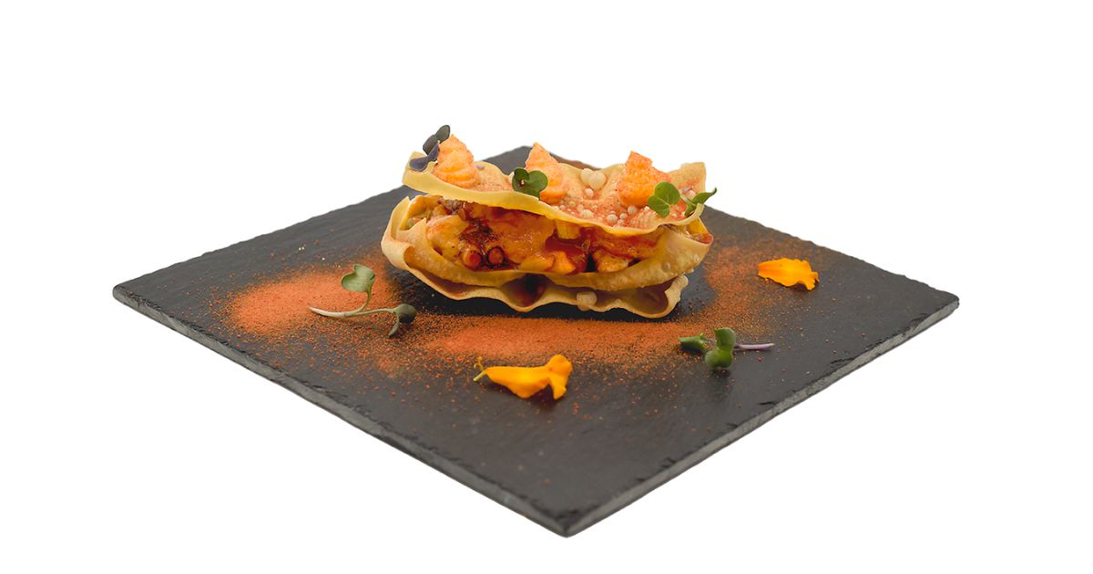- Ingredientes: Pulpo, masa wanton, polvo de tomate deshidratado, pimiento verde y rojo, cebolla, vino blanco, AOVE, mayonesa, pimentón, ajo, sal, laurel.