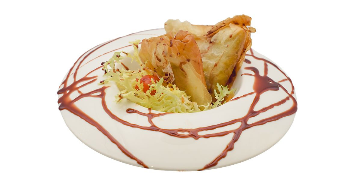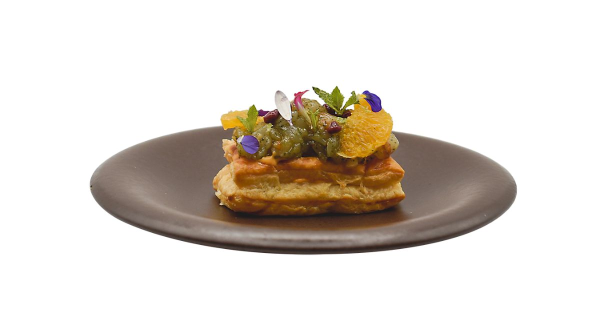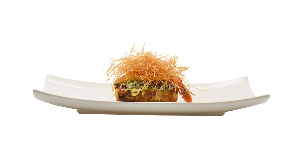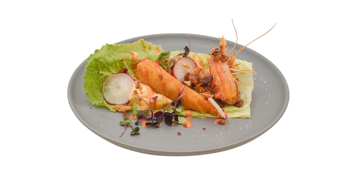 - Ingredientes: Curry, pan, huevo, nata, limón, lima, naranja, soja, arbequina, sweet chilly, jengibre, lechuga, cebolla roja, alcaparras, pepinillo, mayonesa japonesa, sriracha, queso crema, gambón, kataifi, sal.