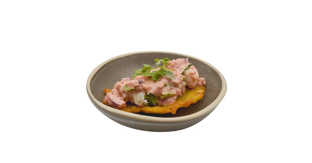 - Ingredientes: Gambón, cilantro, cebolla roja, limón, salsa de tomate.