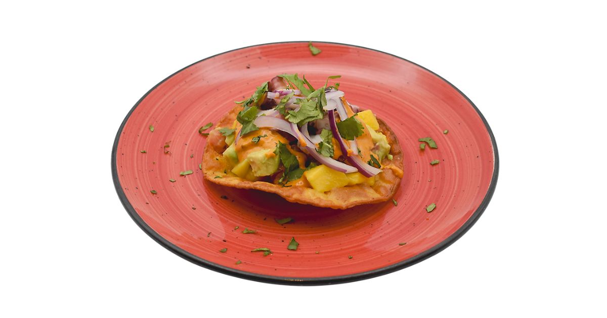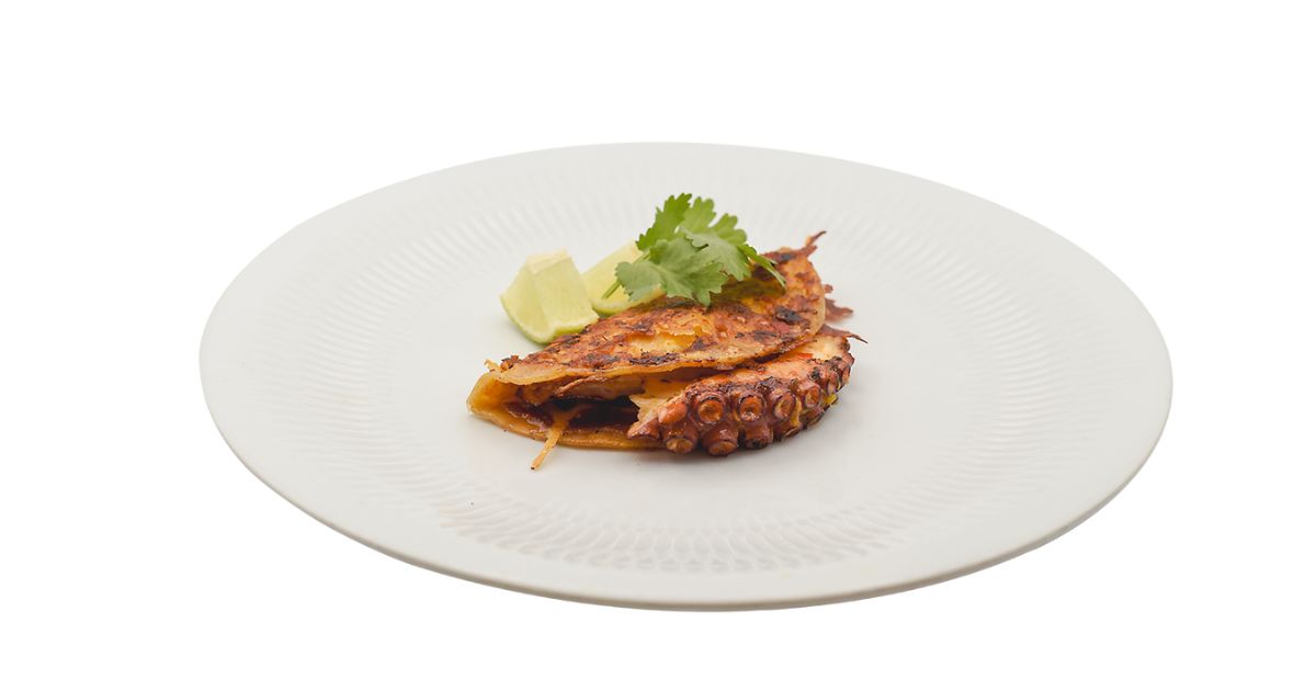 - Ingredientes: Pulpo, aguacate, tomate, cebolla morada, mango, emulsión de chipotle con hierbabuena, tortilla de maíz crujiente, limón.